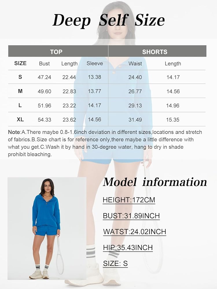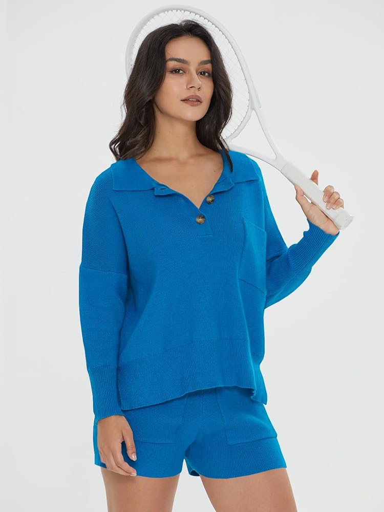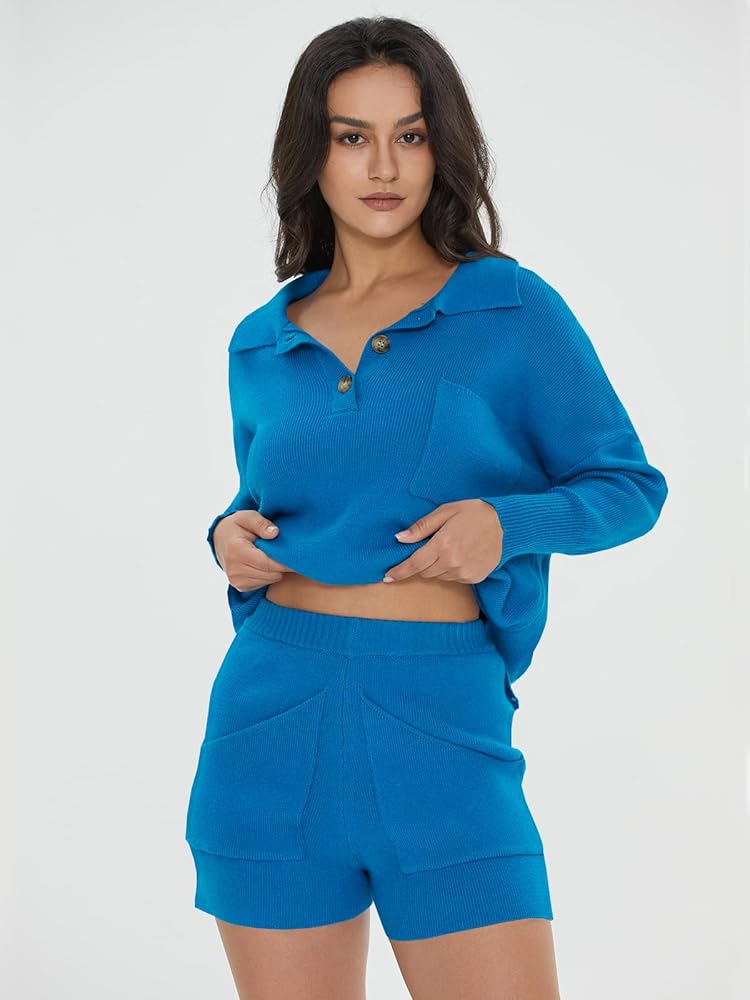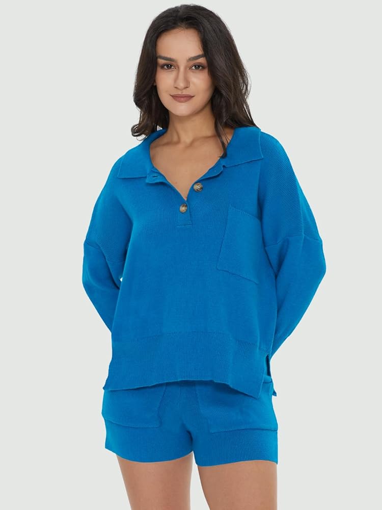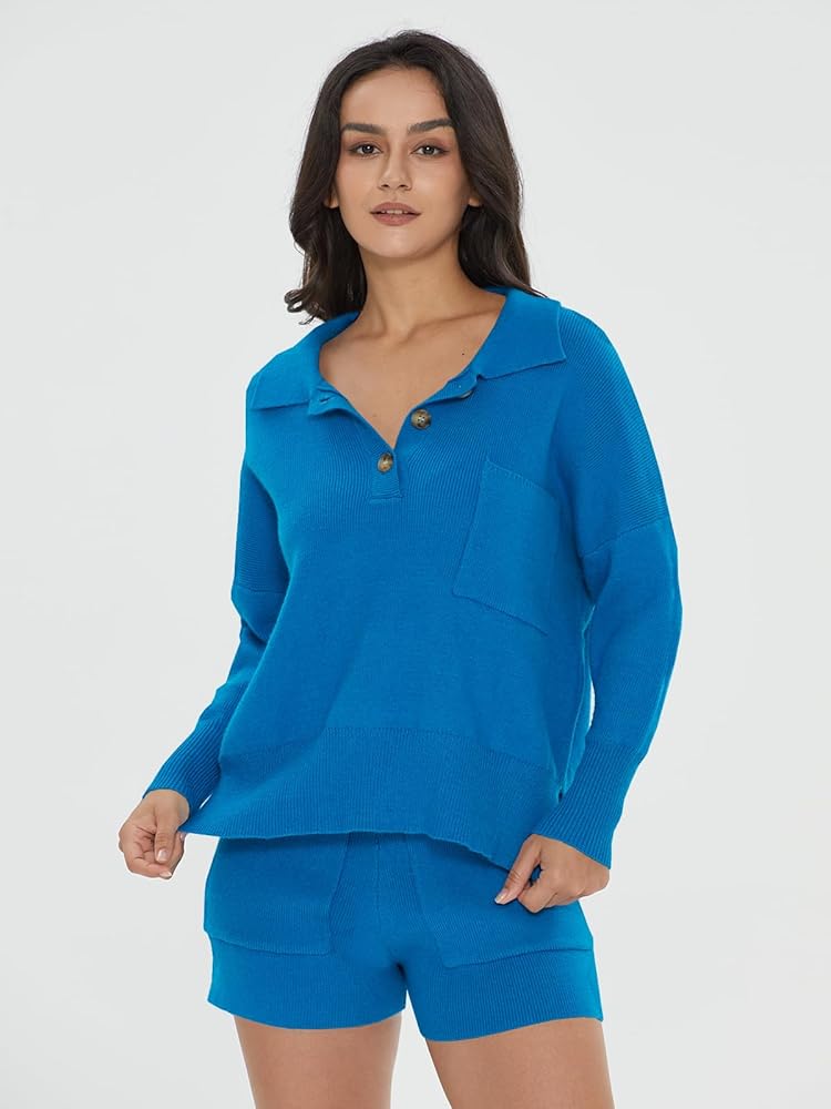 المزايا: ياقة بأزرار ورقبة على شكل حرف V وأكمام طويلة مع تصميم أساور مضلعة، نمط فضفاض. شورت سترة بخصر عالٍ مع حزام خصر مطاطي قابل للتعديل وجيبين جانبيين. جذابة ومريحة للغاية بينما لا تزال تبدو لطيفة ومتماسكة!