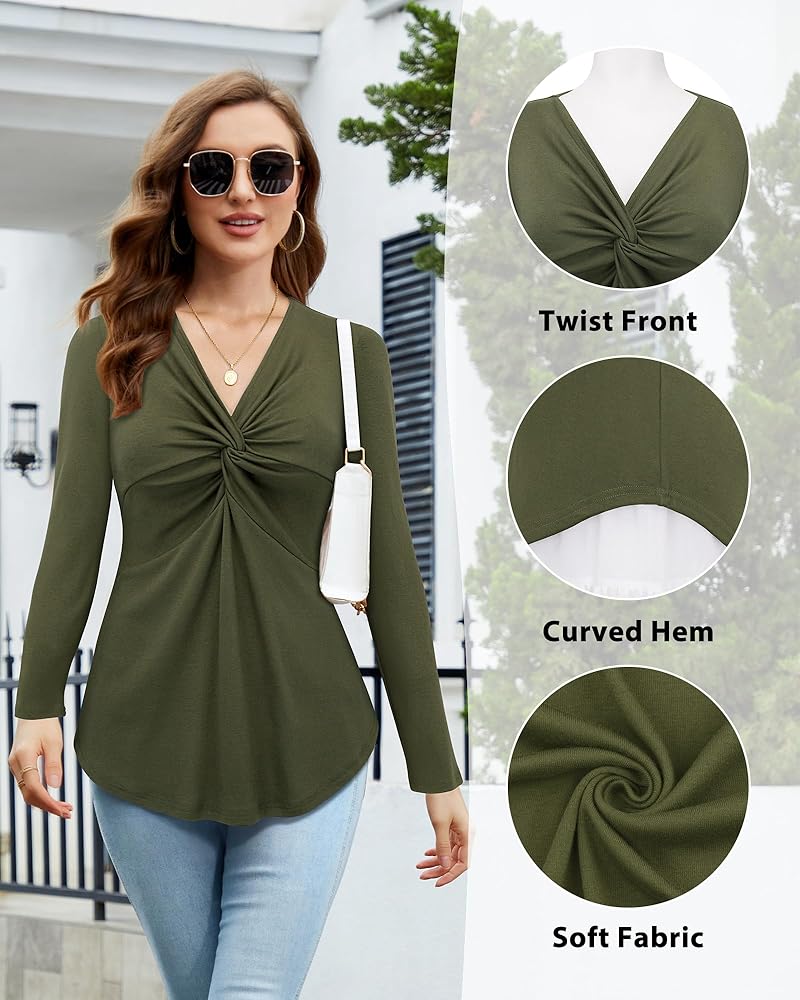 تصميم أمامي ملتوي -- البلوزة ذات الرقبة على شكل حرف V ستحتضن منحنياتك للحصول على الشكل النحيف المثالي. تصميم العقدة الملتوية يخلق كشكشة رقيقة أسفل الجزء الأمامي من البلوزة، مما يجعلك تبدين أكثر أنوثة وإثارة