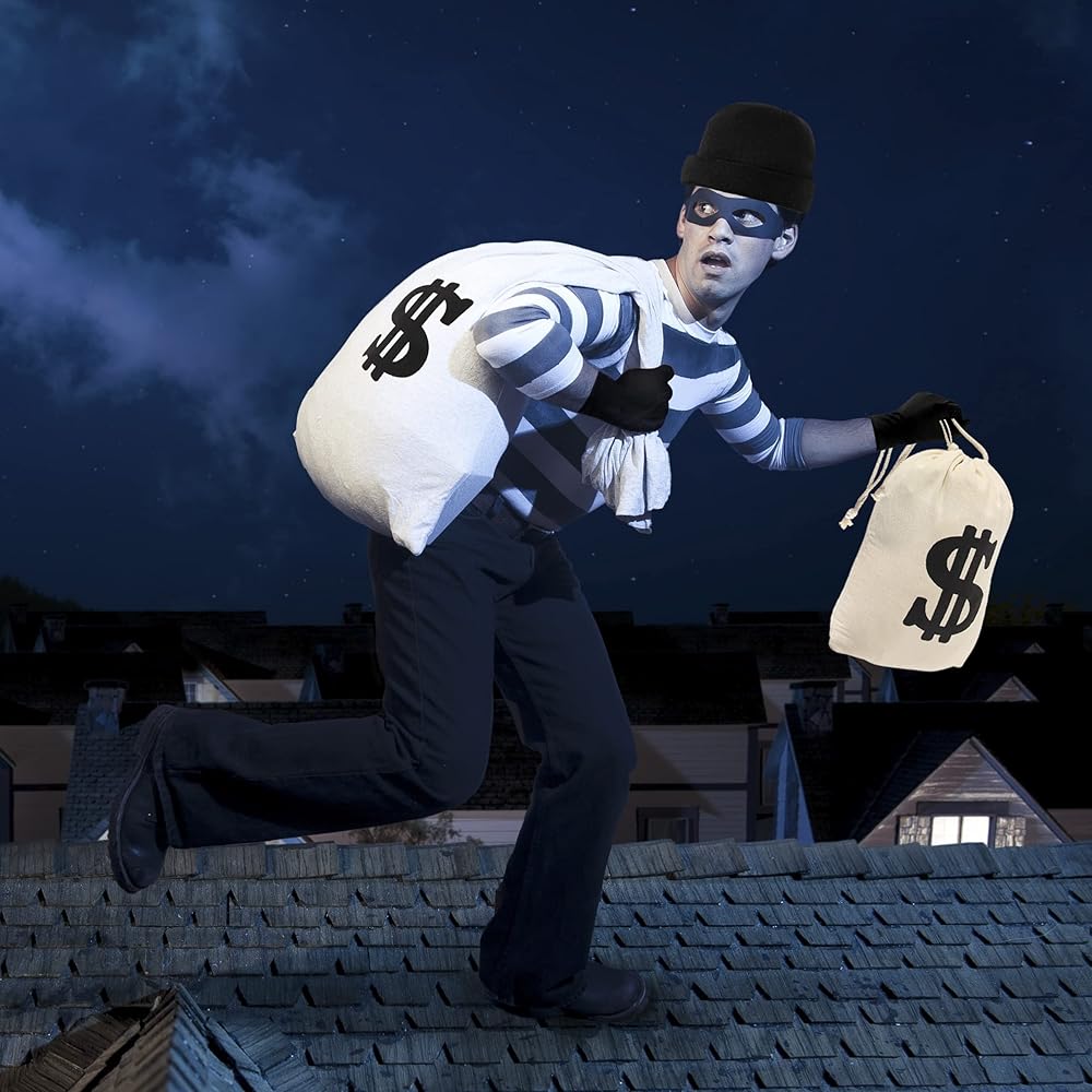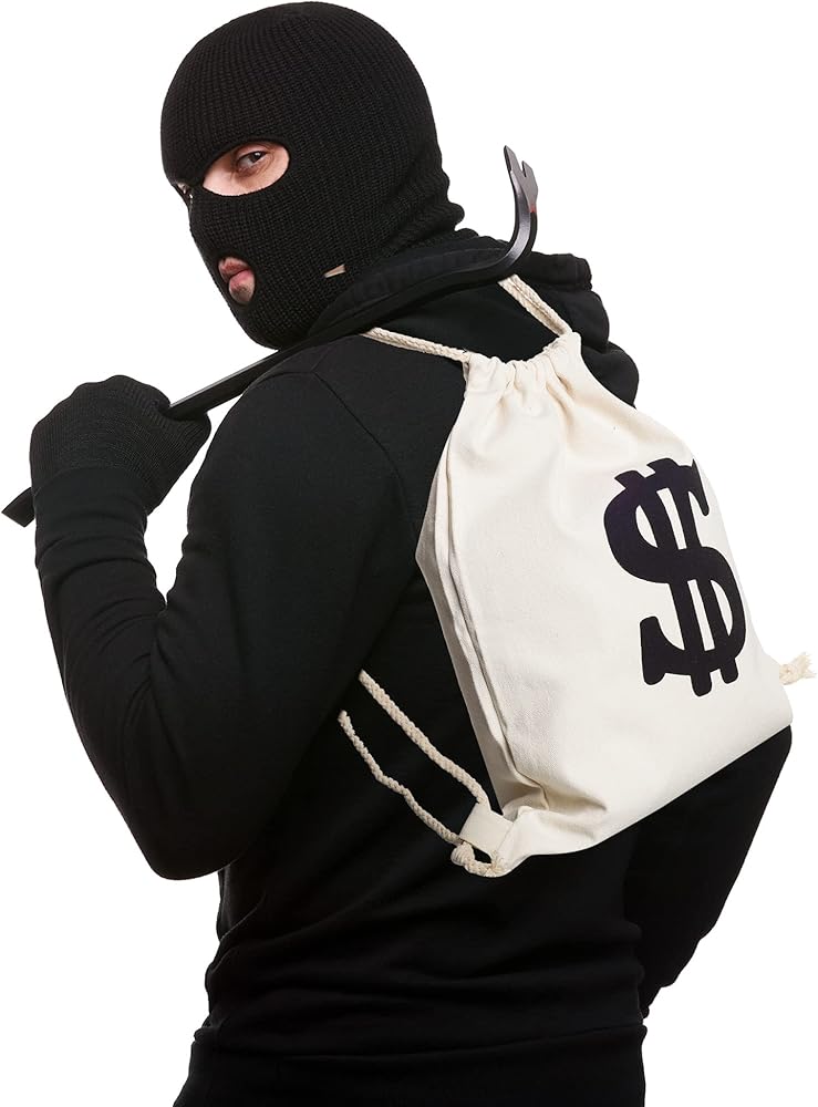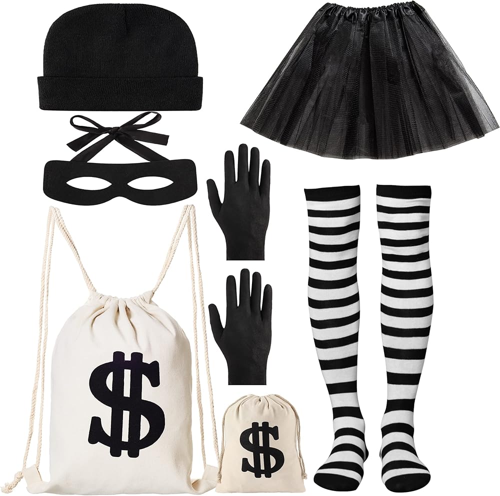 YAROMO Robber Cosplay Costume Set for Girls Women, Include Black and White Striped Long Socks Black Skirt Dollar Sign Money Canvas Bag Bandit Eye Mask Knit Beanie Cap for Halloween Party Favors