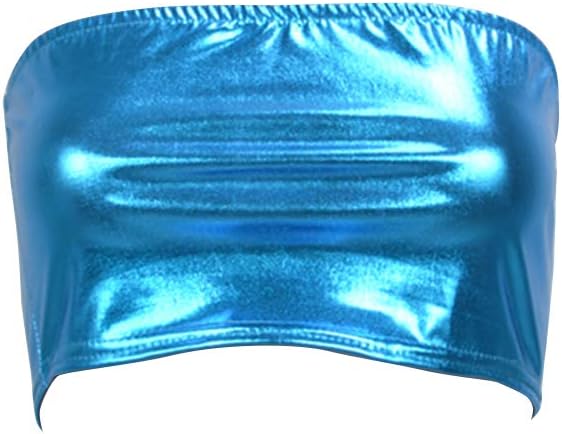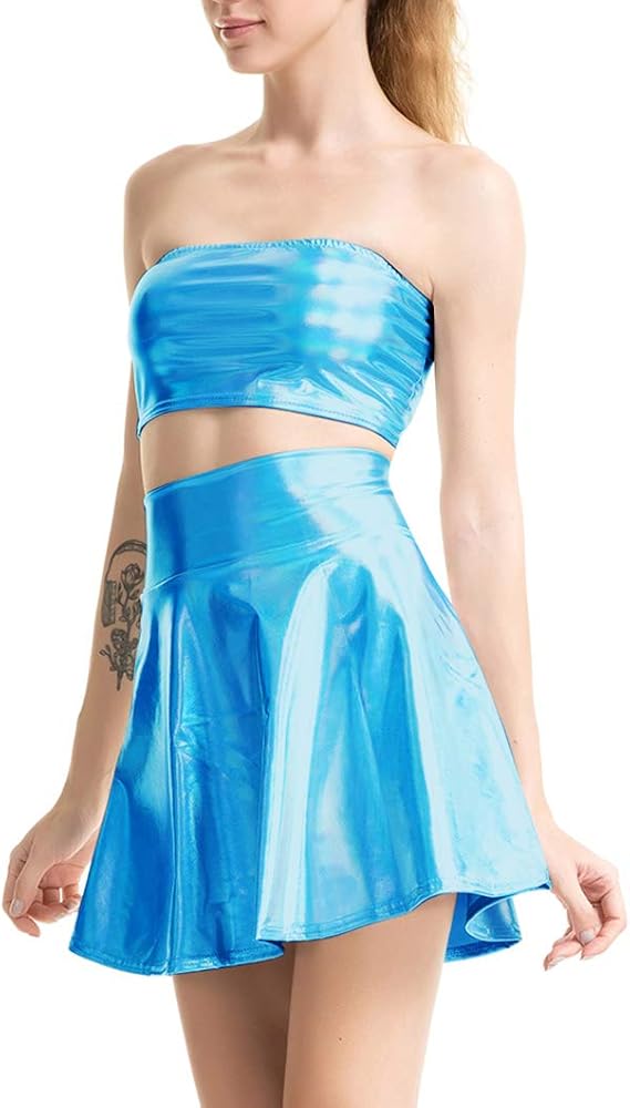 بلوزة نسائية من FlyCC لامعة بدون أكتاف معدنية + فستان قصير مكون من قطعتين