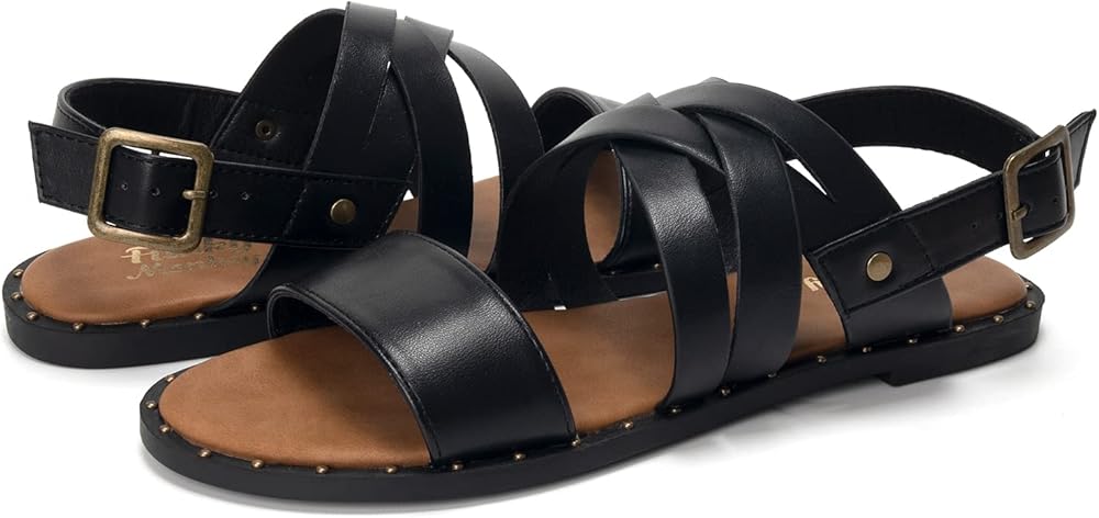 صندل نسائي مسطح بأشرطة مع أبازيم معدنية، وحزام كعب قابل للتعديل لسهولة الارتداء والخلع، لجعل الصندل مناسبًا لقدميك، والحفاظ على الراحة والثبات طوال اليوم.