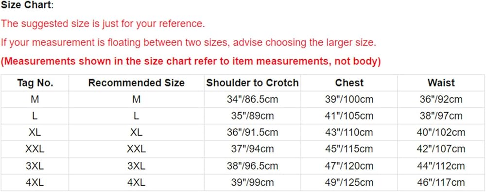 Tag No.---|---Recommended Size---|---Shoulder to Crotch---|-----Chest-----|-----Waist--