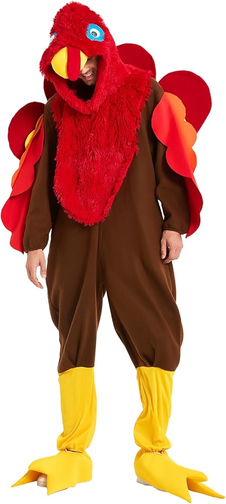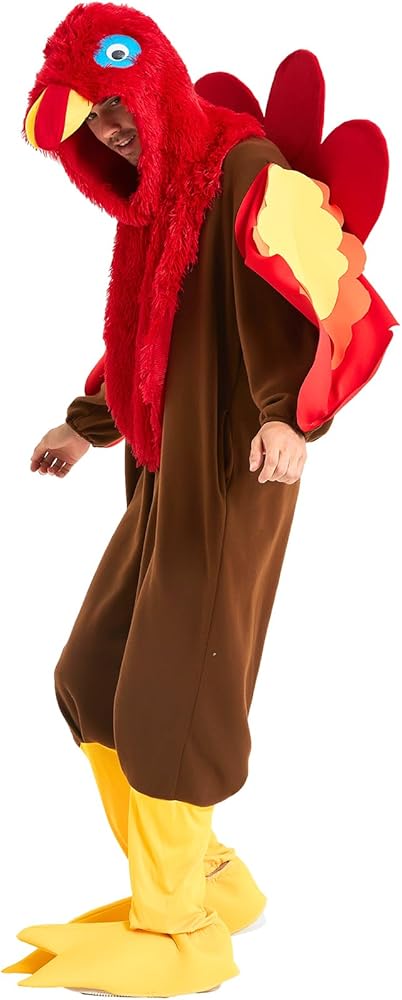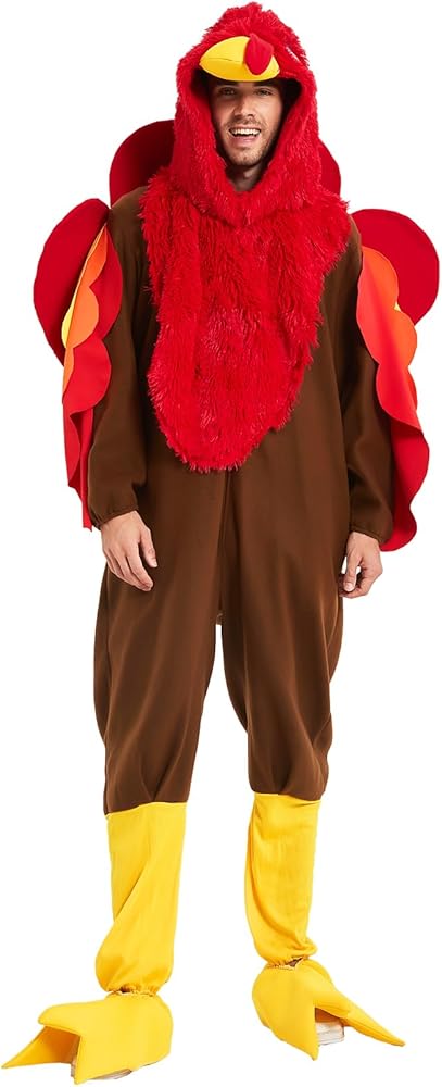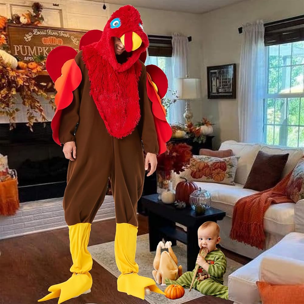 زي ممتع للغاية: كن ديكًا روميًا رائعًا! هذا زي ديك رومي مدهش، مما يجعل متعة عيد الشكر رائعة ويترك لك ذكرى لا تُنسى. بالتأكيد المزيج المثالي من الراحة والمرح. الجسم البني مقترن بأجنحة ديك رومي ملونة، ويتميز بغطاء للرأس مع عيون ومنقار، والعيون المهتزة تجلب المزيد من الضحك والبهجة، وتظهر حكمتك. لن يعجب أحد بهذا الديك الرومي اللطيف والذكي والحيوي. تتيح لك أن تكون دائمًا في جو سعيد وتجذب انتباه الجميع