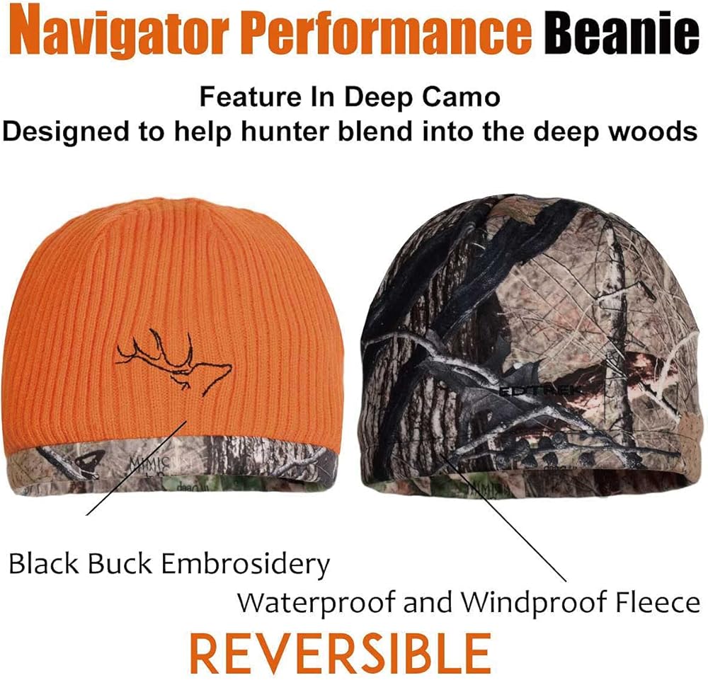 REVERSIBLE AND LOOKS GREAT - Blaze orange on acrylic side with quality buck embroidery and camo decoration, IN DEEP camo on the fleece side. A rugged beanie for outdoorsman finally look good and feel good. Whether you are wearing our navigator beanie for style, work, or exploring the outdoors, you can be sure it'll hold up