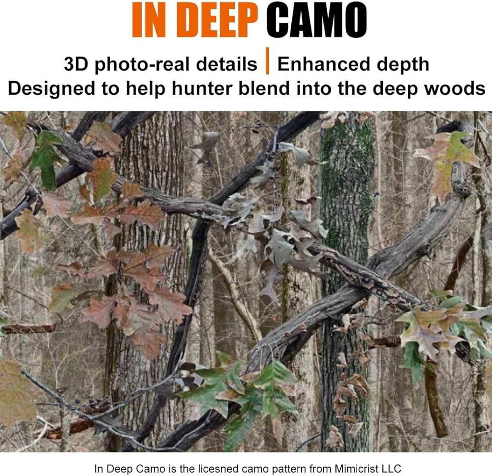 EFFEECTIVE CONCEALMENT- In Deep camo is designed to help hunter blend into the deep woods. It has great 3D photo-real details and enhanced depth