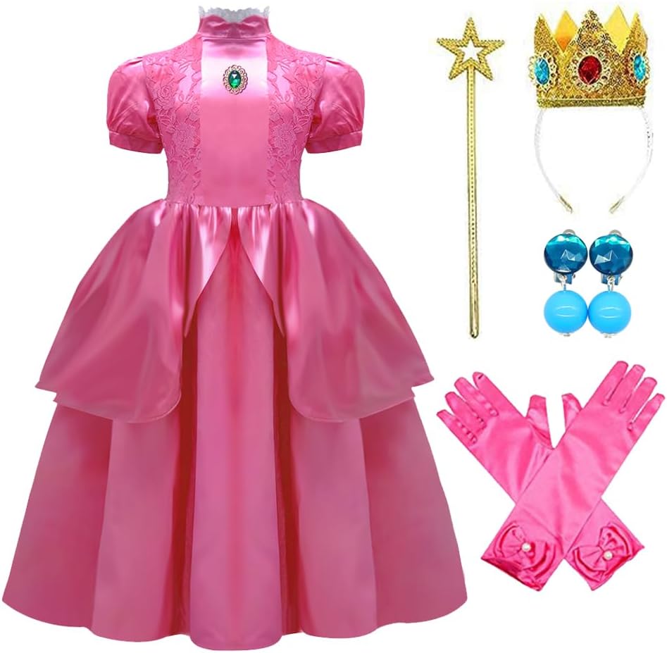 • مجموعة أميرة الخوخ: ثوب * قطعة واحدة، عصابة شعر تاج * قطعة واحدة، أقراط * زوج واحد، بروش حجر الراين * قطعة واحدة، قفازات الأميرة * زوج واحد، عصا سحرية * قطعة واحدة. نسخة طبق الأصل لمظهر الأميرة بيتش الجميل والشجاع في الفيلم، سوف تصاب الفتيات بالجنون بسببه.