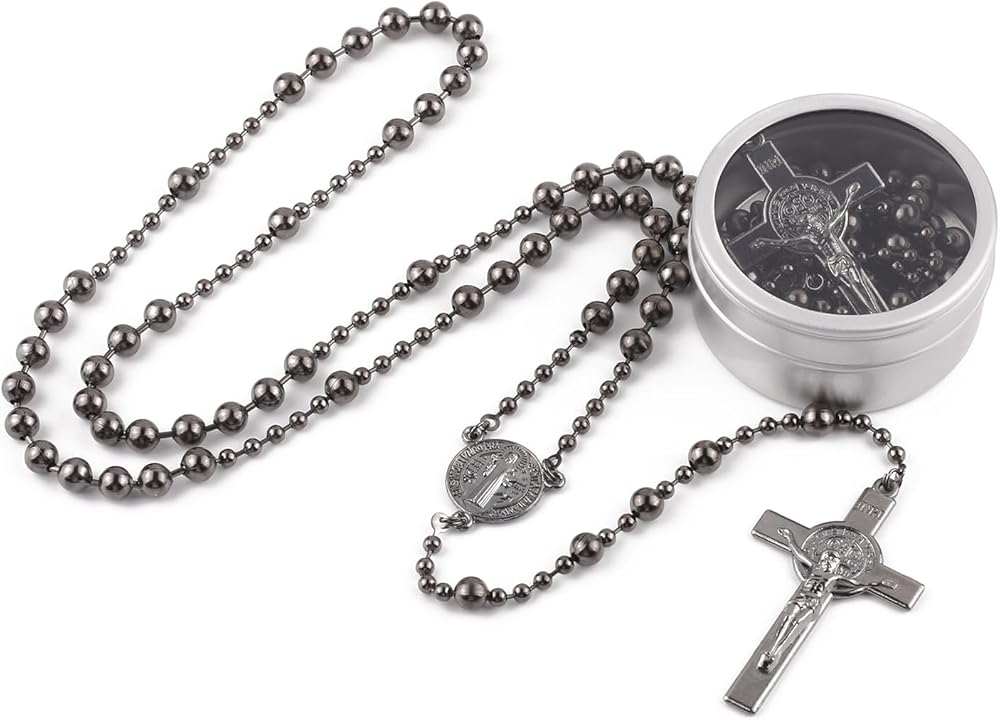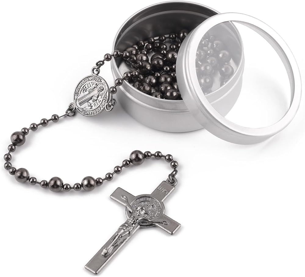 عبوة هدايا - هذه المسبحة القوية والمتينة تمثل هدية مدروسة وذات مغزى لسنوات قادمة. معبأة في صندوق معدني دائري من روزاريز وهو رائع لتقديم الهدايا وتخزينها. وحقيبة مخملية لتخزين القلادة، كما يمكنك تجميعها بشكل جيد لحملها في جيبك وإحضارها إلى كل مكان.
