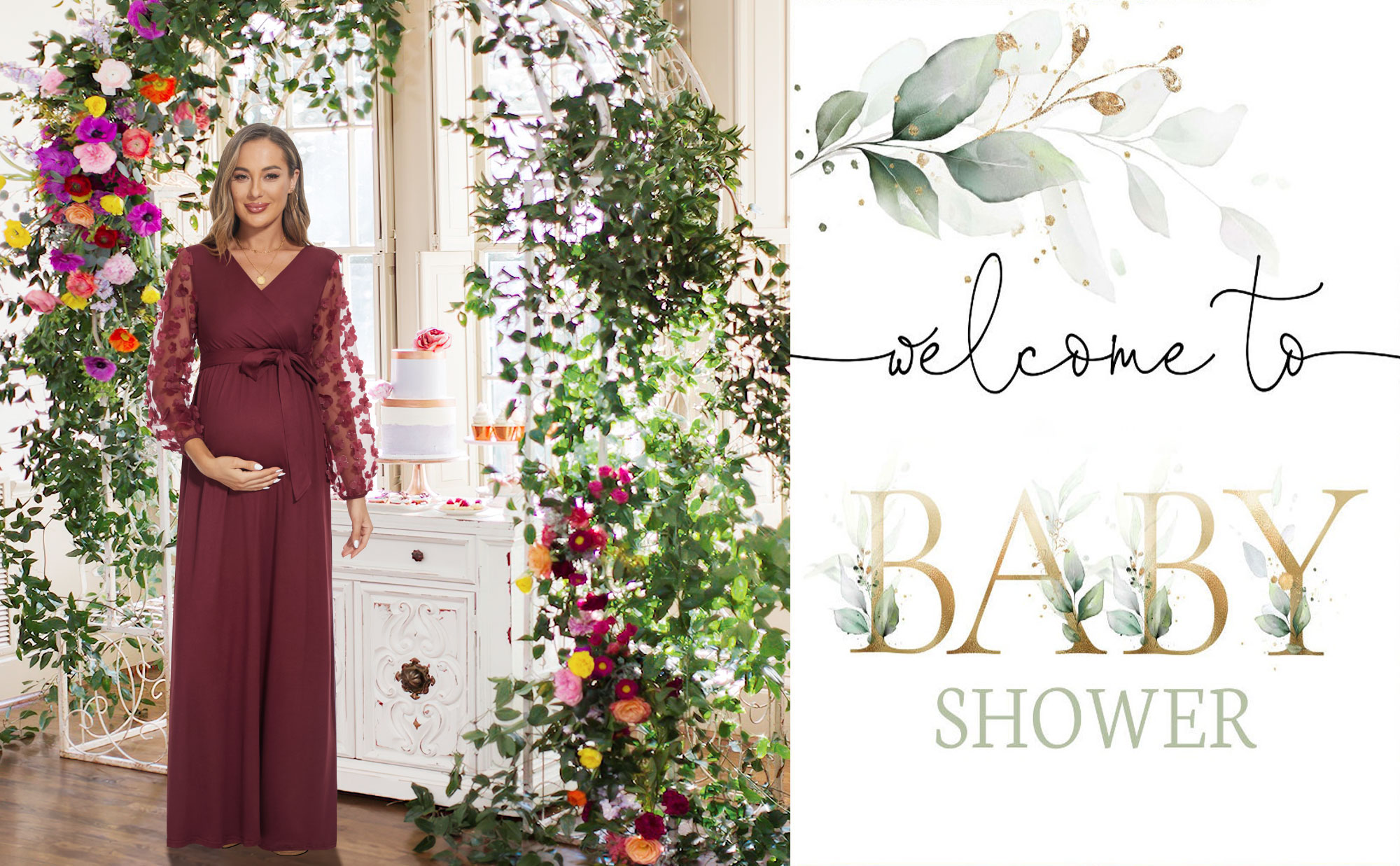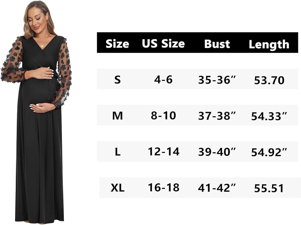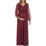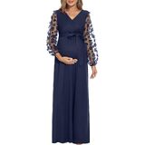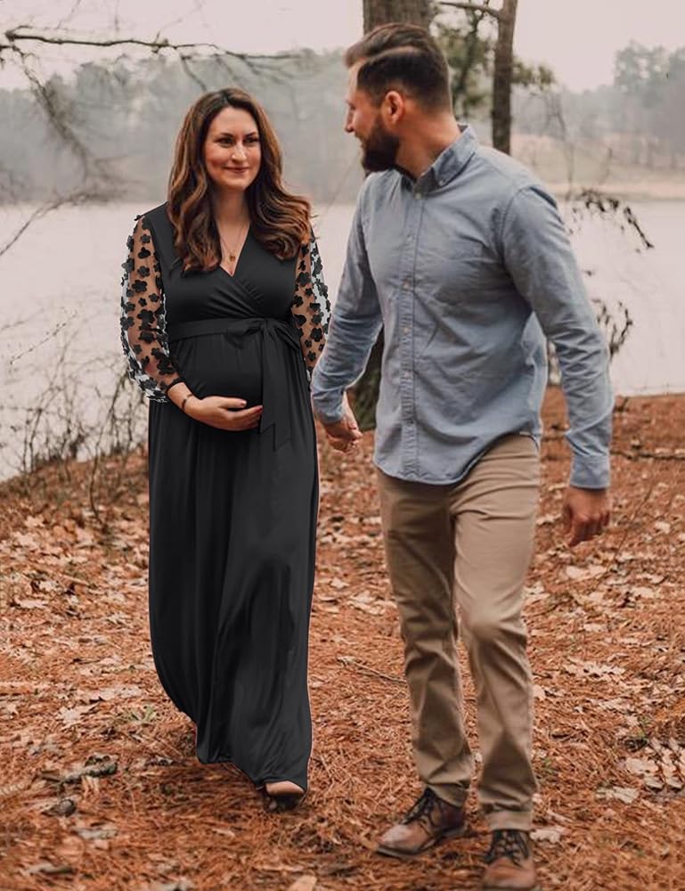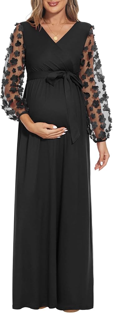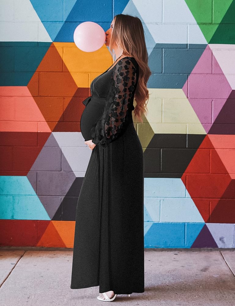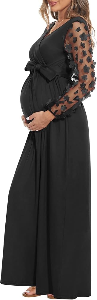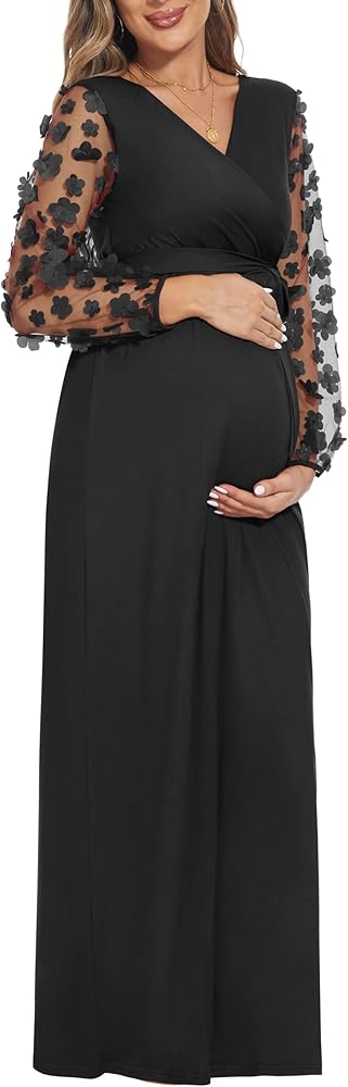 [كم من الدانتيل الزهري] فستان طويل للحمل بأكمام من الدانتيل مع حزام. رقبة على شكل حرف V، خيار الرضاعة الطبيعية سهل الوصول إليه. تصميم مكشكش مع وضع الراحة في الاعتبار لكل مرحلة من مراحل الحمل.