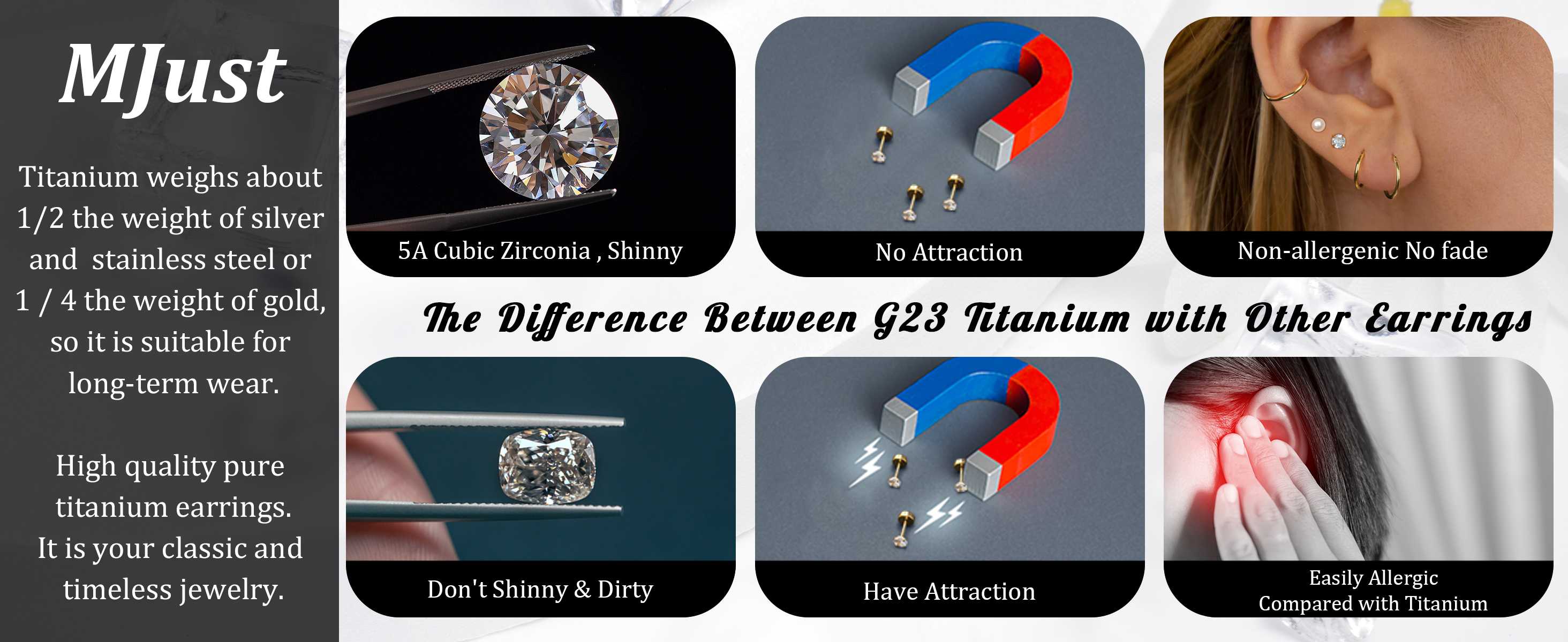 أقراط من التيتانيوم -- مادة قوية ومتينة تحظى بشعبية كبيرة في صناعة المجوهرات. لا يسبب الحساسية، لا يسبب التهيج، خالٍ من النيكل والرصاص. لا تفقد بريقها أو تتحول إلى اللون الأخضر. أقراط التيتانيوم النقي هي خيار رائع لأولئك الذين يبحثون عن مجوهرات آمنة ومريحة لارتدائها يوميًا.