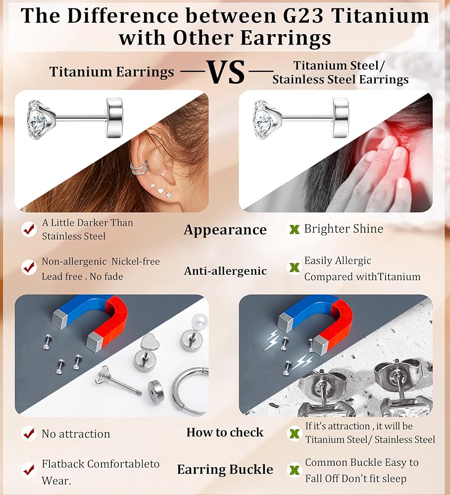 أقراط من التيتانيوم للأذن الحساسة - هذه الأقراط المسطحة الخلفية مصنوعة من التيتانيوم G23 عالي الجودة مع أحجار زركونيا مكعب 5A. تصميم سطح أملس ومصقول للغاية من المرجح أن ينحني أو يخدش. لذا فإن هذه الأقراط المصنوعة من التيتانيوم ذات الظهر المسطح تسمح لك بالنوم أو القيلولة دون إزالة الأقراط. لا يسبب الحساسية وخفيف الوزن. مثالي لأذنيك الحساسة.