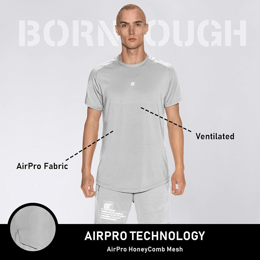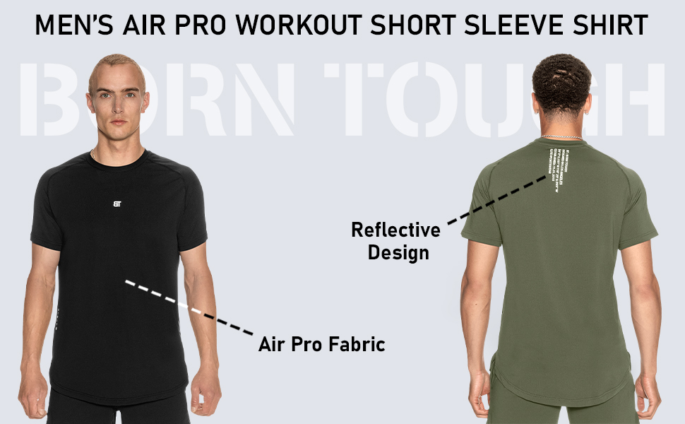 [AIR PRO FABRIC] - قمصان Born Tough Air Pro الرجالية قصيرة الأكمام مصنوعة من مادة مرنة ومريحة تُعرف باسم نسيج Air Pro؛ يتكون نسيج Air Pro من عنصرين: البوليستر والياف لدنة؛ يشكل البوليستر 86% من هيكل القمصان الرجالية الرياضية هذه، وهو المسؤول عن متانتها وطول عمرها؛ تشكل الألياف اللدنة 14% من تركيبة القمصان الرجالية قصيرة الأكمام وتعمل كعامل ربط يقوي الدرزات.