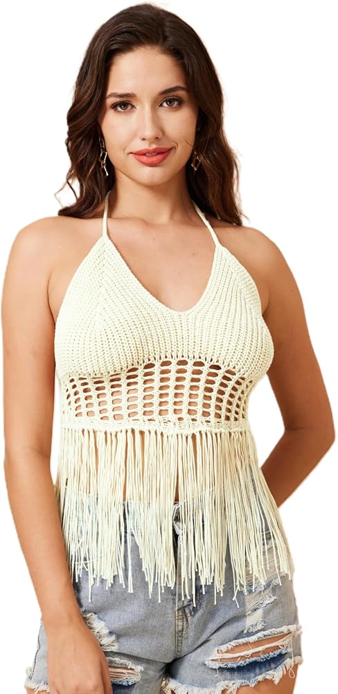 ملابس سباحة نسائية من OYOANGLE مفرغة من الكروشيه بأهداب مكشوفة الظهر وحمالات ملابس سباحة لتغطية الجزء العلوي من ملابس الشاطئ