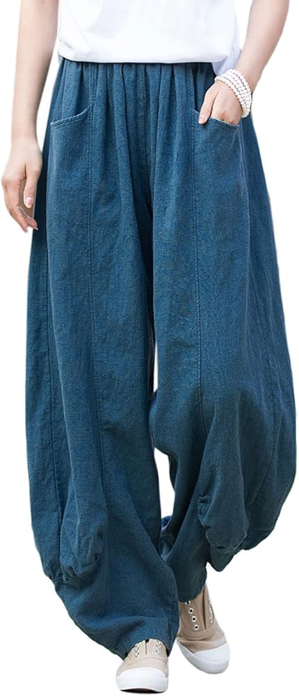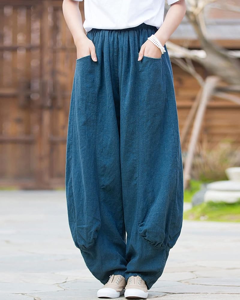 - الجزء الأمامي مزود بجيبين، بين الساقين المنخفض، نمط فضفاض، بنطال كابري للترفيه