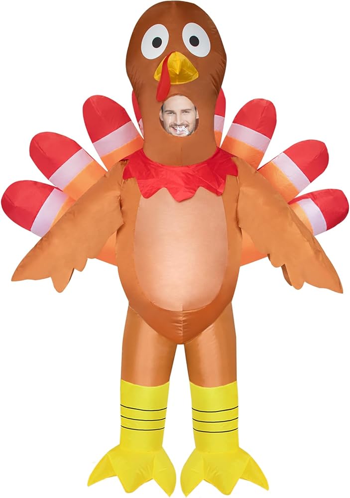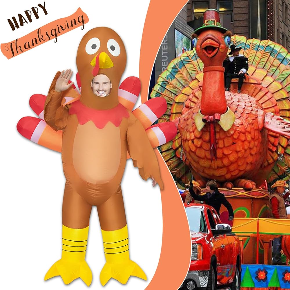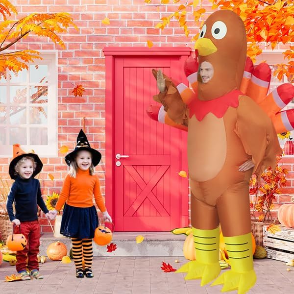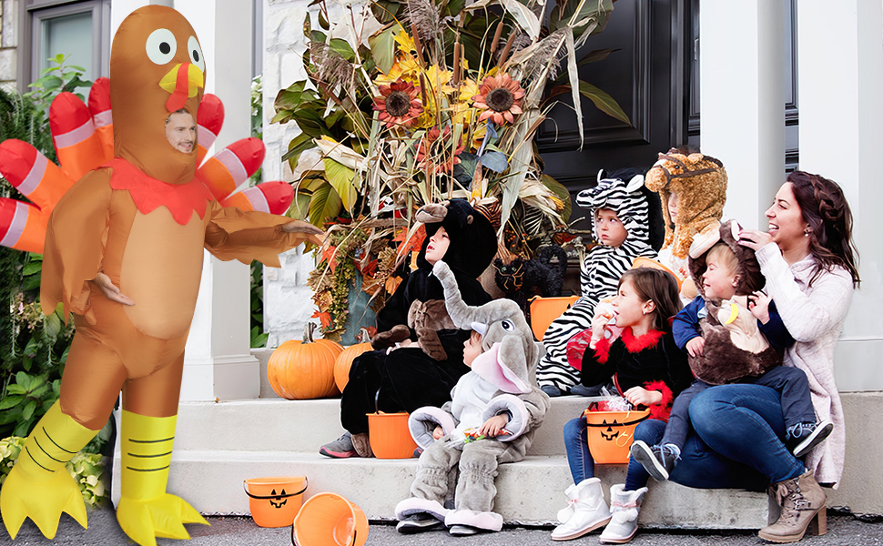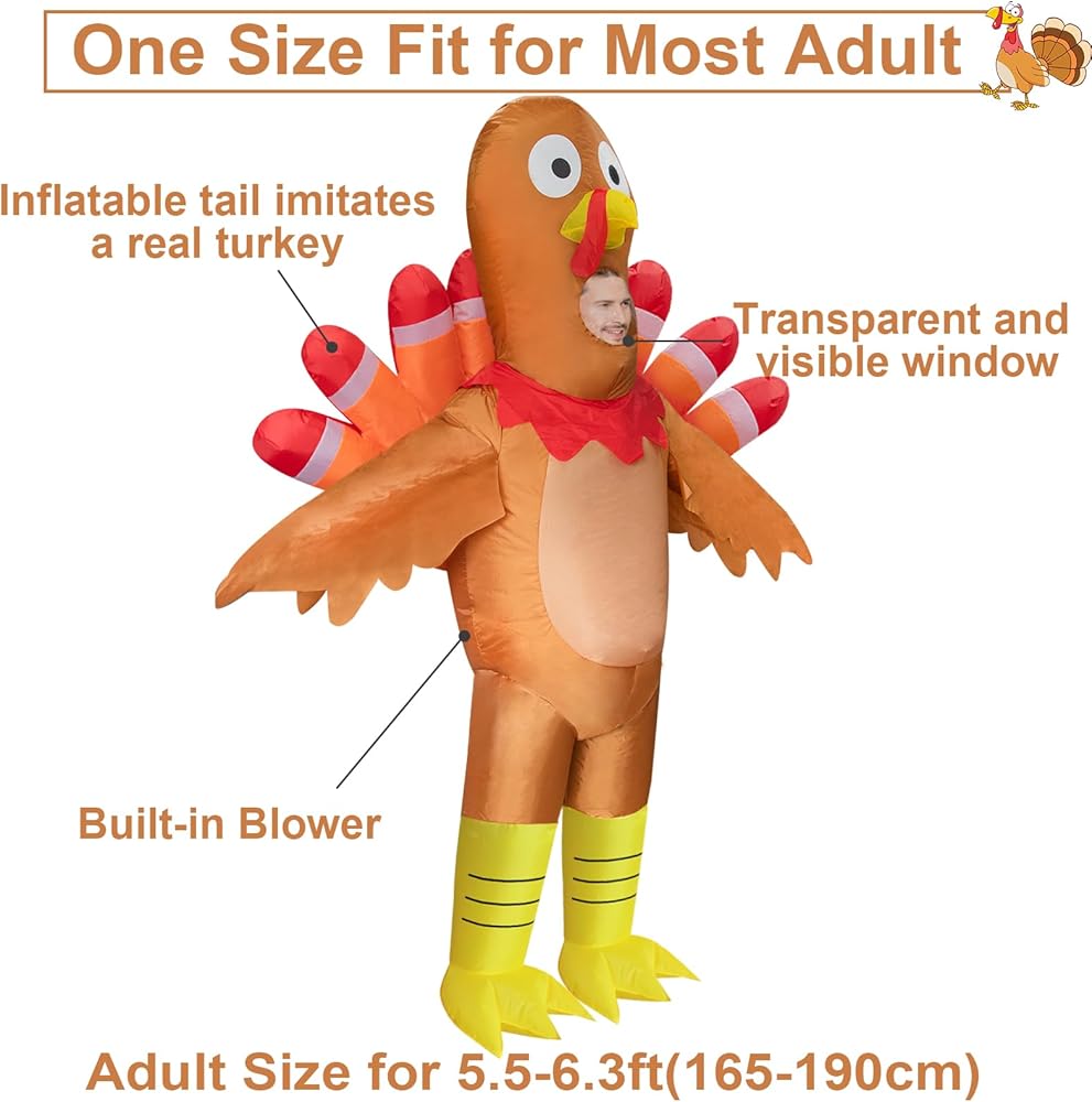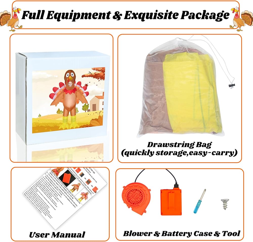 🆙 【خامة فاخرة مطورة】زي عيد الشكر للبالغين مصنوع من البوليستر بنسبة 100% وهو قوي ومتين وعديم الرائحة حتى لا تقلق أبدًا بشأن أي تمزقات أو ثقوب. من السهل جدًا نفخ زي الديك الرومي المنفوخ، والذي يتميز بمروحة عالية الجودة تعمل بالبطارية ستجعله ينفجر في غضون ثوانٍ، ويستمر في النفخ.