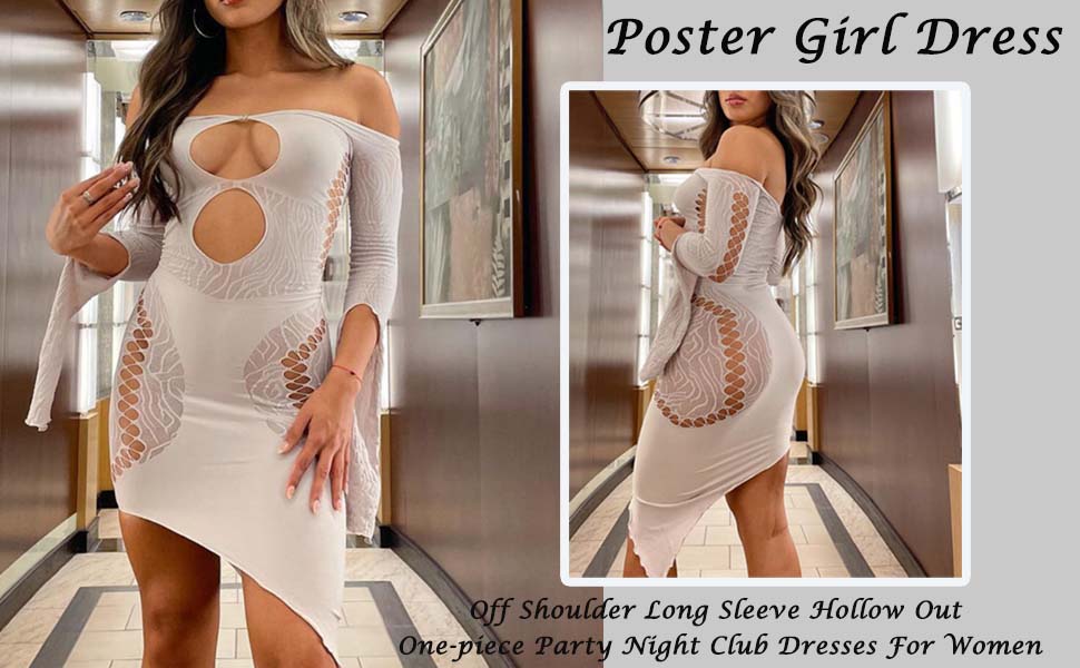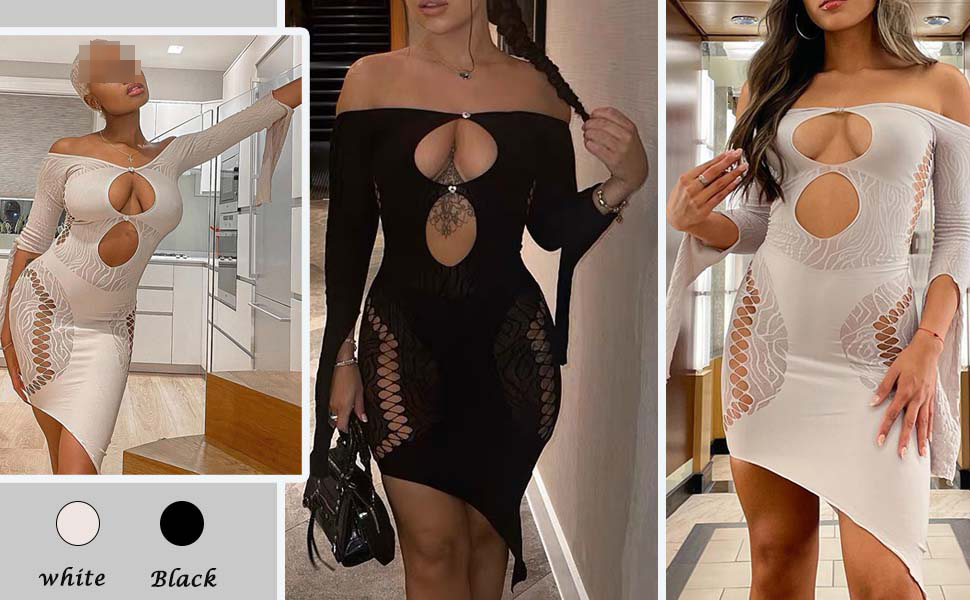 اللون: أبيض/أسود بدون أكتاف وأكمام طويلة مجوفة من قطعة واحدة فساتين الحفلات الليلية للنساء لها مقاس متوسط واحد فقط، يرجى الرجوع إلى جدول المقاسات الخاص بنا قبل طلب فساتين الفتيات الملصقة.
