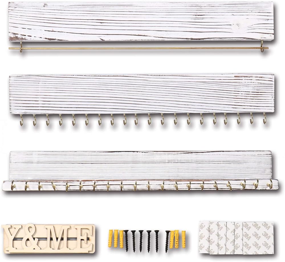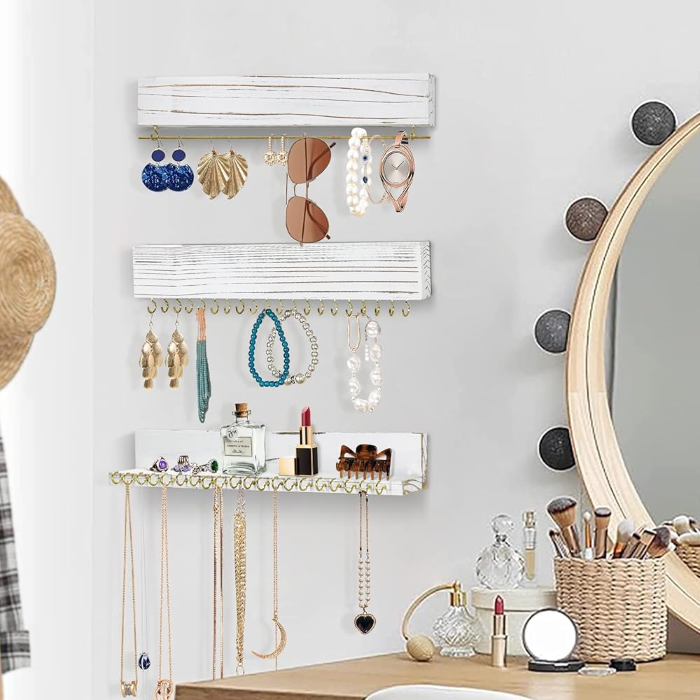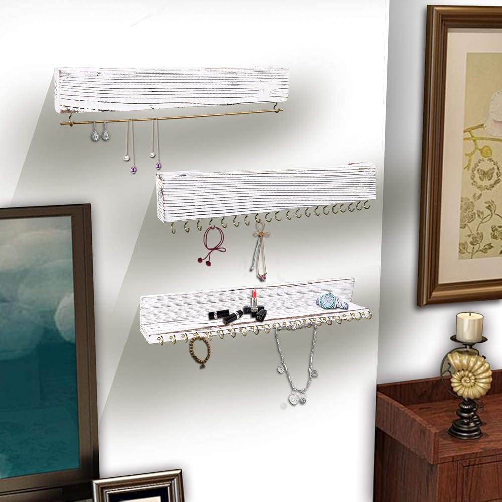يتكون حامل المجوهرات الخاص بنا من 3 قطع، وقد تم تصميم كل رف حائط لعرض المجوهرات بعناية. تشتمل هذه المجموعة من أرفف تخزين المجوهرات العائمة على حامل سوار مع قضيب معدني وحامل قلادة منظم للقرط مع 20 خطافًا معدنيًا لكل منها للحفاظ على مجوهراتك معًا بشكل أنيق.