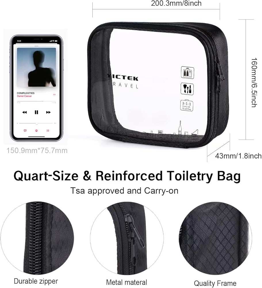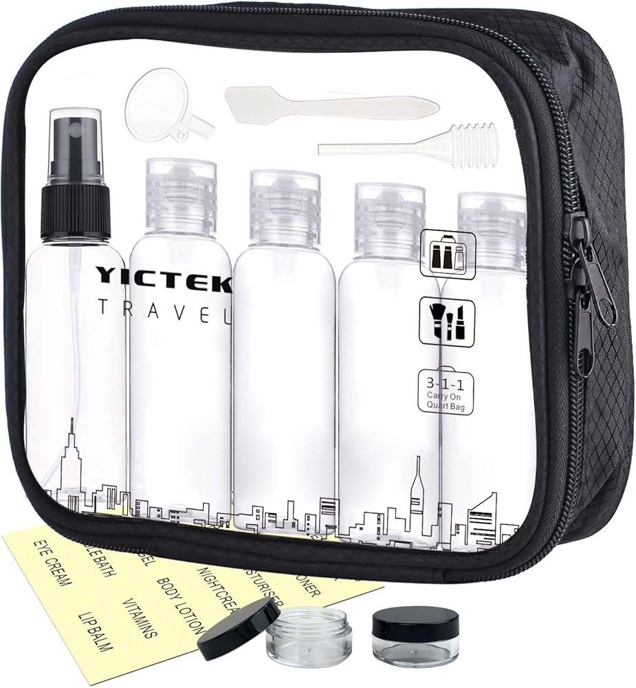 حاويات زجاجات السفر من YICTEK لمستلزمات النظافة المعتمدة من إدارة أمن المواصلات الأمريكية مع حقيبة بحجم كوارتز شفاف، مجموعة زجاجات بلاستيكية قابلة لإعادة الملء للسوائل