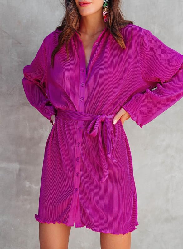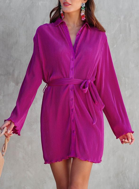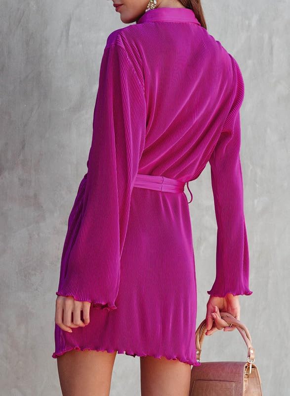 التصميم: يتميز هذا الفستان بياقة على شكل حرف V، وأزرار سفلية من الأمام، وحزام خصر مربوط، مما يبرز الشكل مع إضافة لمسة من الرقي بأكمامه الطويلة المطوية.