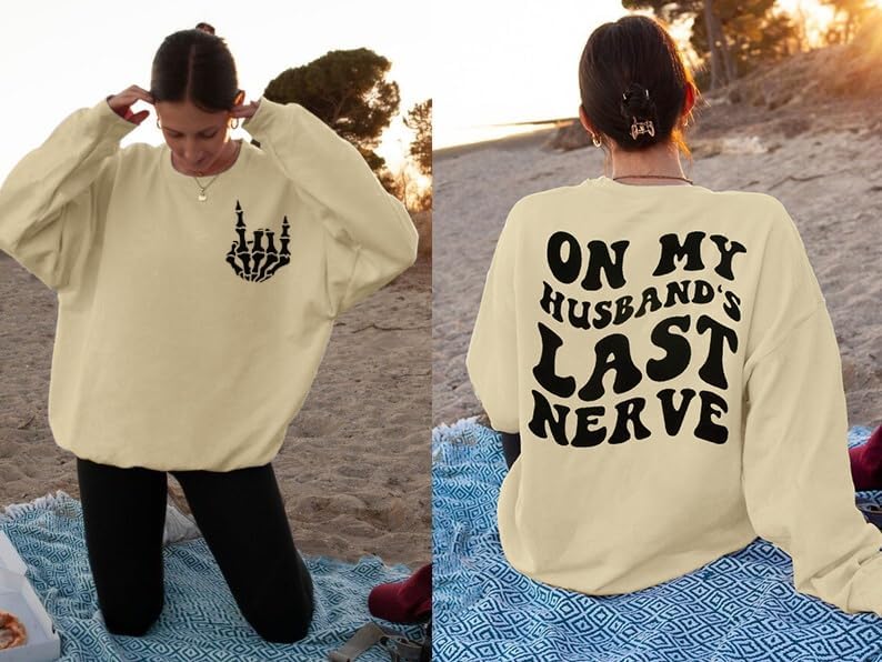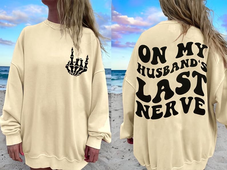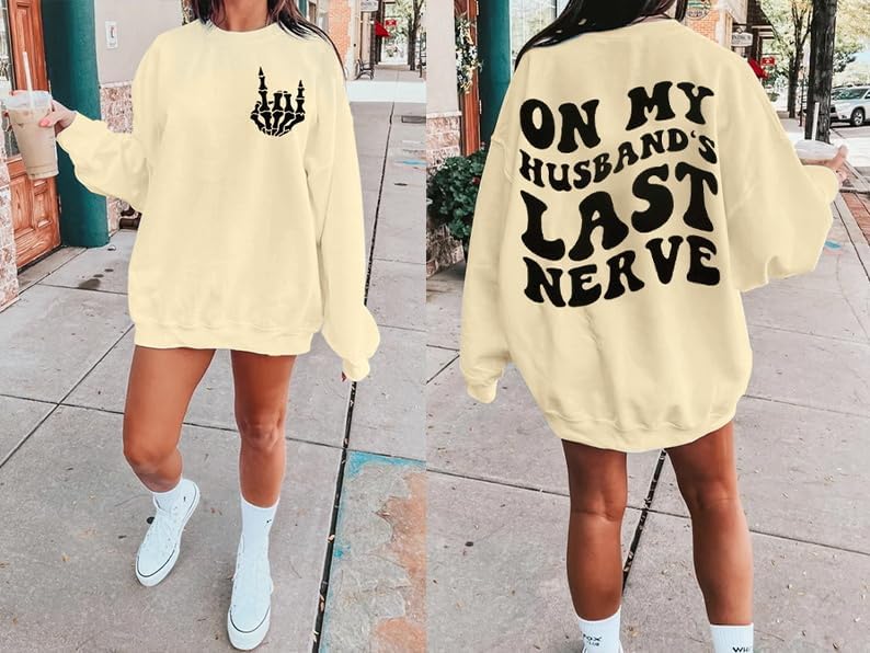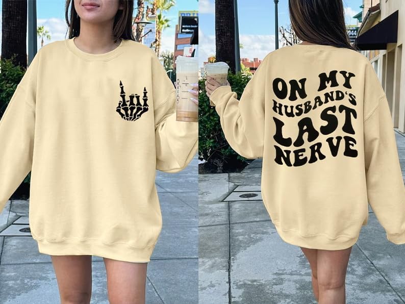 الميزات: على سويت شيرت العصب الأخير لزوجي، قميص حياة الزوجة، سويت شيرت ساخر مضحك، بلوفر علوي للعطلات، بلايز فضفاضة بأكمام طويلة، سويت شيرت مطبوع عليه حروف مضحكة.