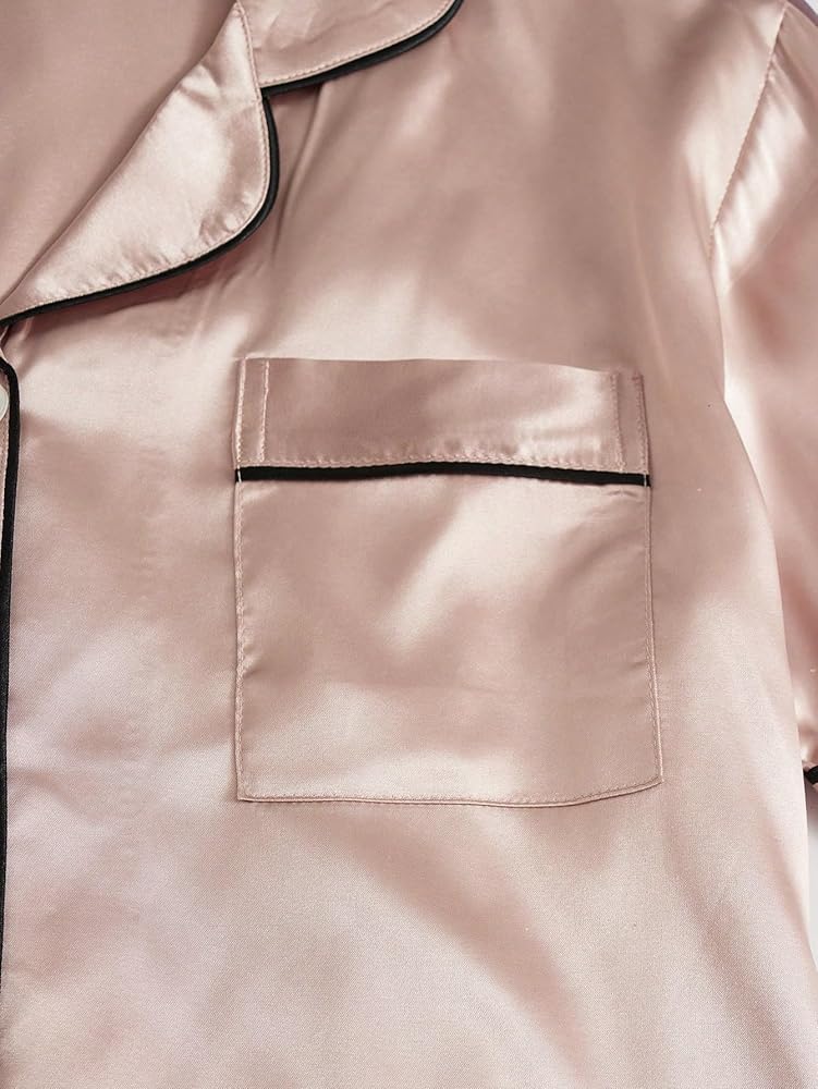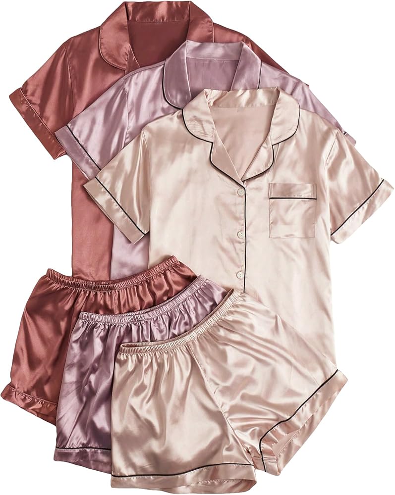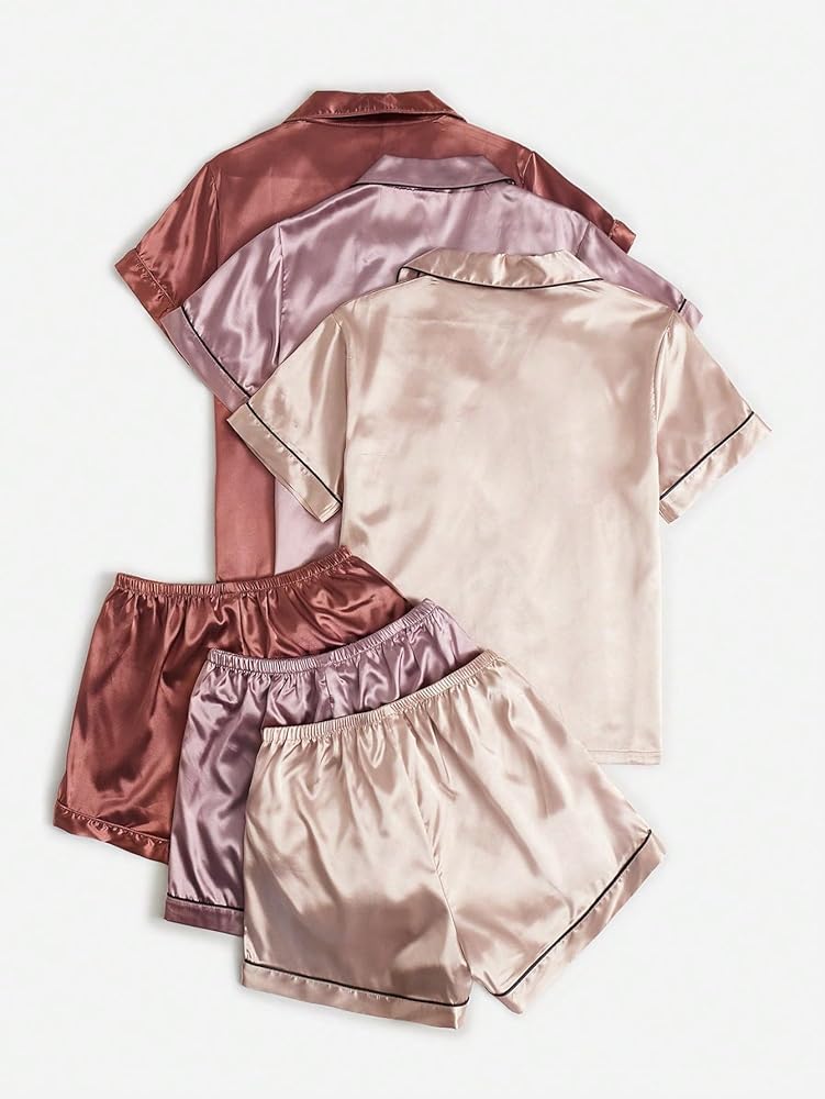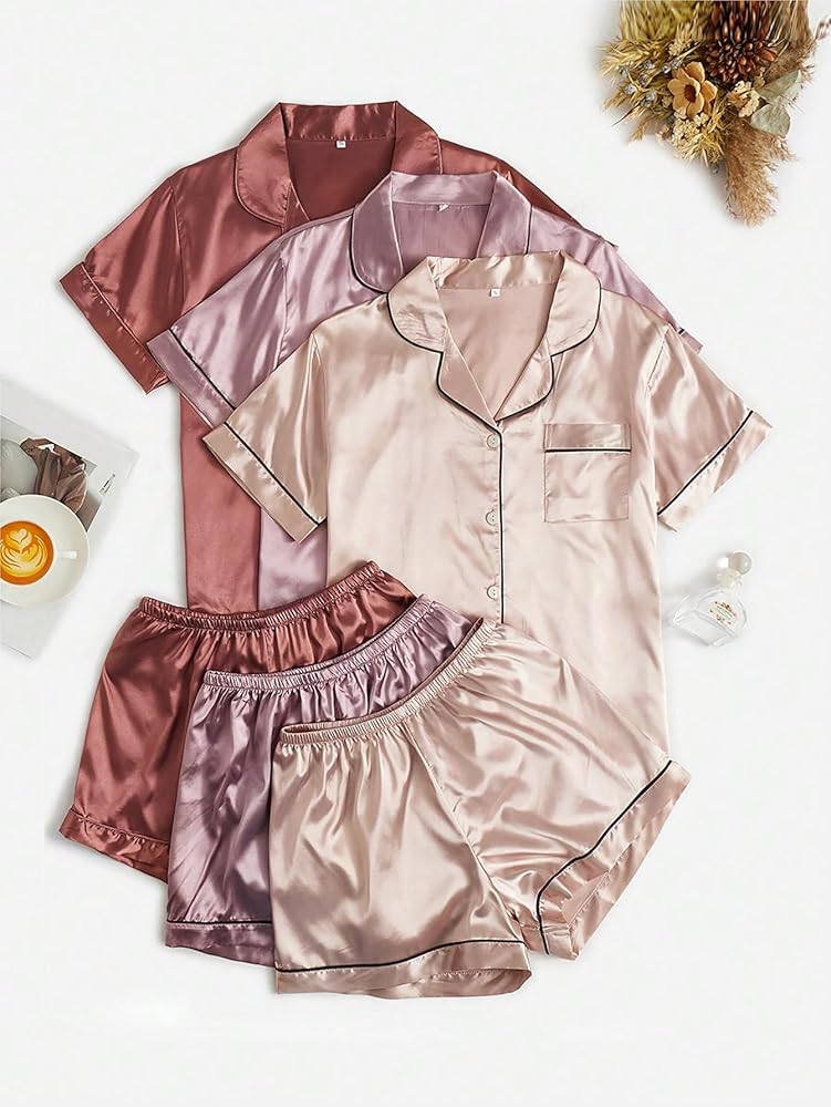 - المزايا: لون موحد، كم قصير، رقبة على شكل حرف V، جيب، قميص علوي بأزرار لأعلى مع شورت خصر مرن، طقم بيجامة عصري من 3 مجموعات للنساء