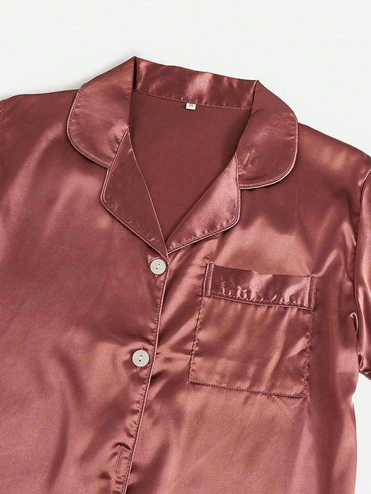 - قميص من الحرير الساتان بأكمام قصيرة وياقة على شكل حرف V وأزرار للأسفل مع شورت بخصر مطاطي