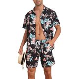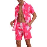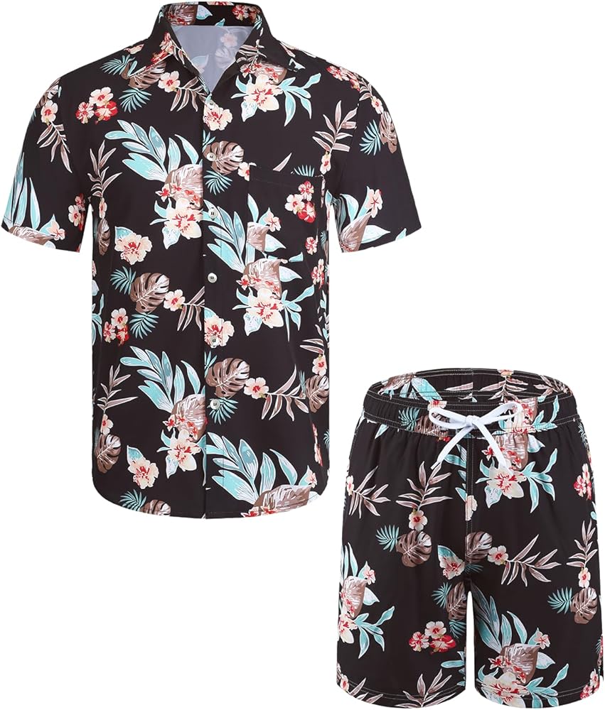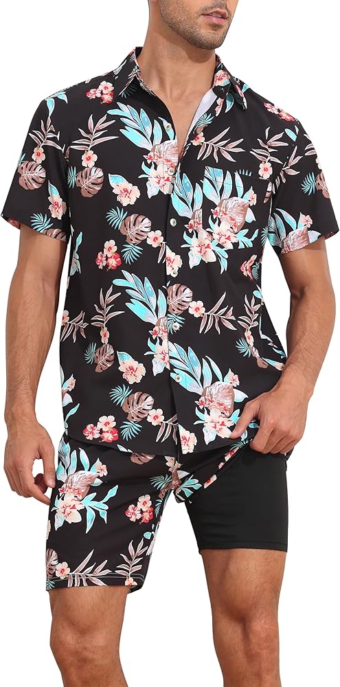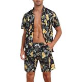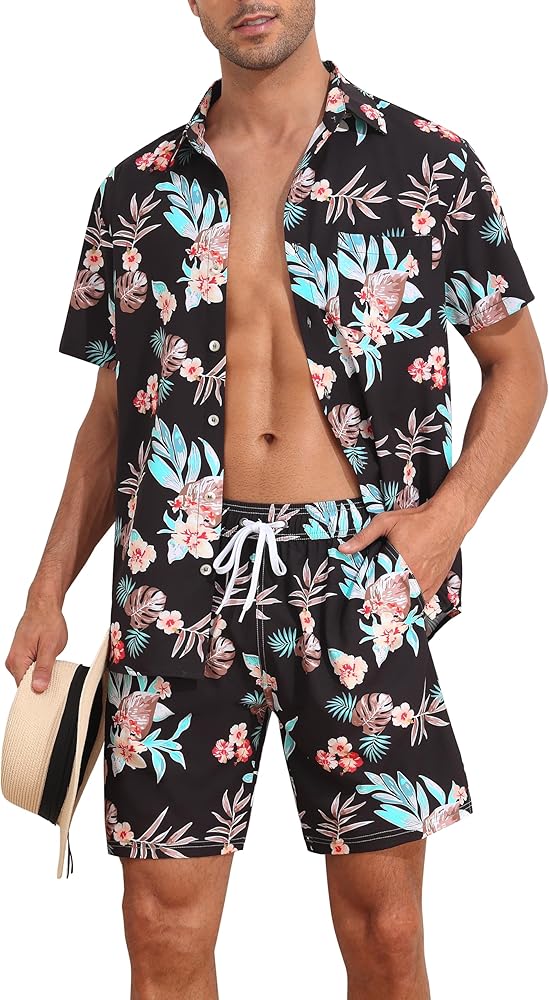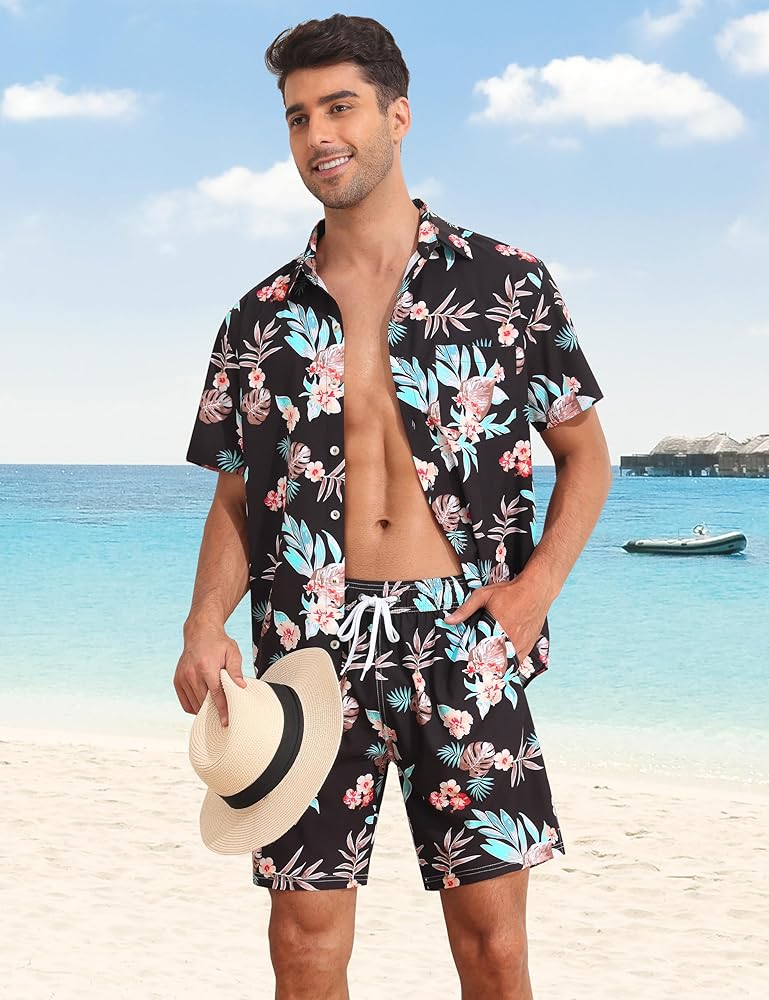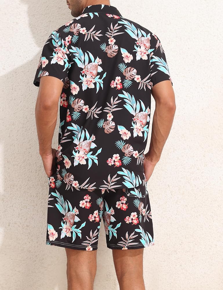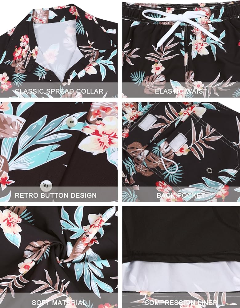 المواد: قميص هاواي رجالي ومجموعة قصيرة مصنوعة من البوليستر بنسبة 100%، ناعم، خفيف الوزن، مسامي، مريح ويحافظ على الشعور بالانتعاش في اليوم الحار
