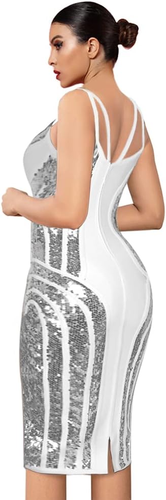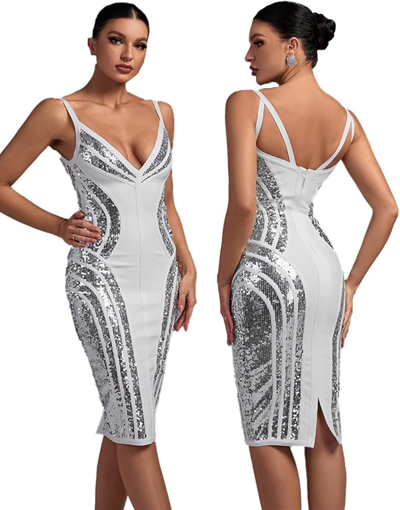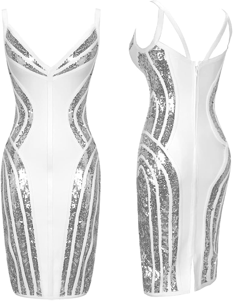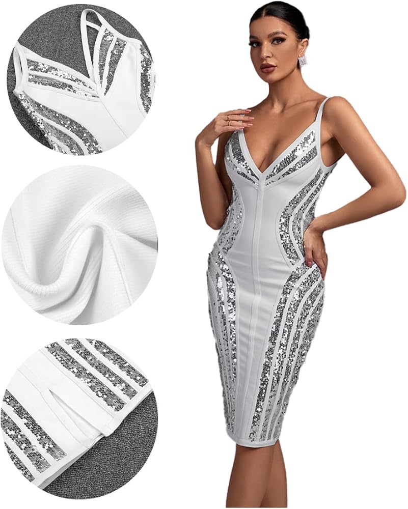 ❥المميزات: يتميز فستان Bodycon برقبة على شكل حرف V، بدون أكمام، بطول فوق الركبة وتصميم بسحاب خلفي، فستان ترتر، ملابس نادي مثيرة، فستان حفلات مسائية للسيدات.