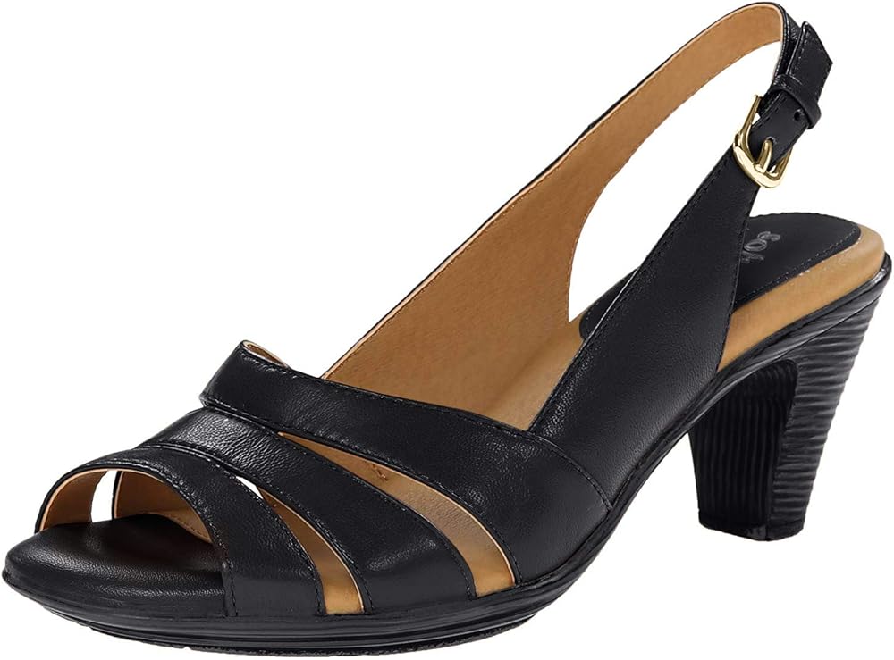 Upper available in various materials and features a sling-back strap with an adjustable buckle closure.