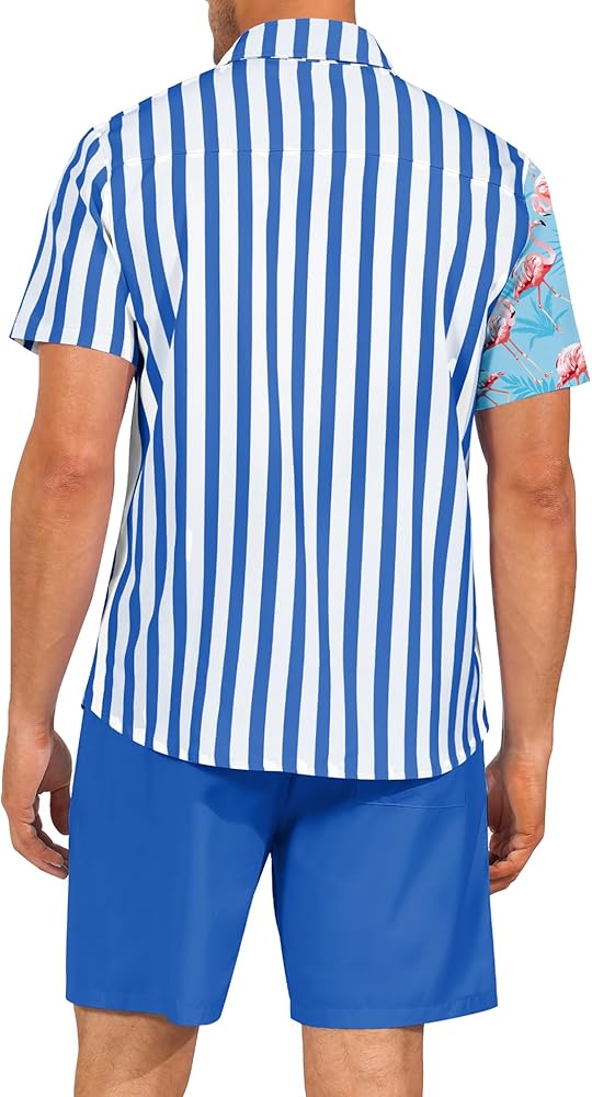 Material: Mens hawaiian shirt and short set are made from 95% polyester and 5% spandex, flamingo striped button down shirt and shorts two piece set for men has a slight stretch, soft, comfortable, breathable lightweight and skin-friendly, stylish men's 2 piece short sets, casual summer short sleeve shirt set.