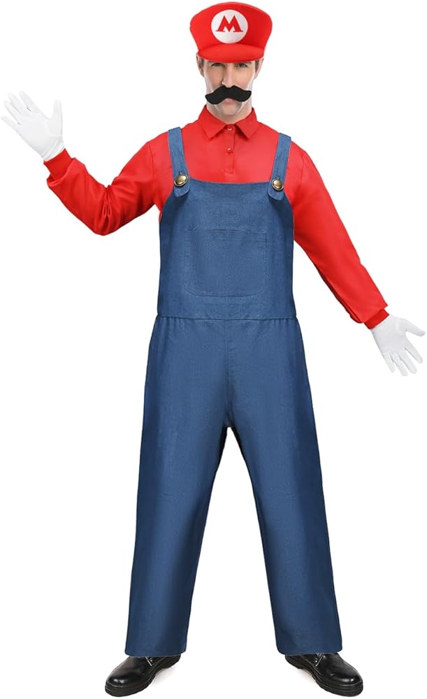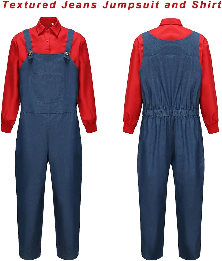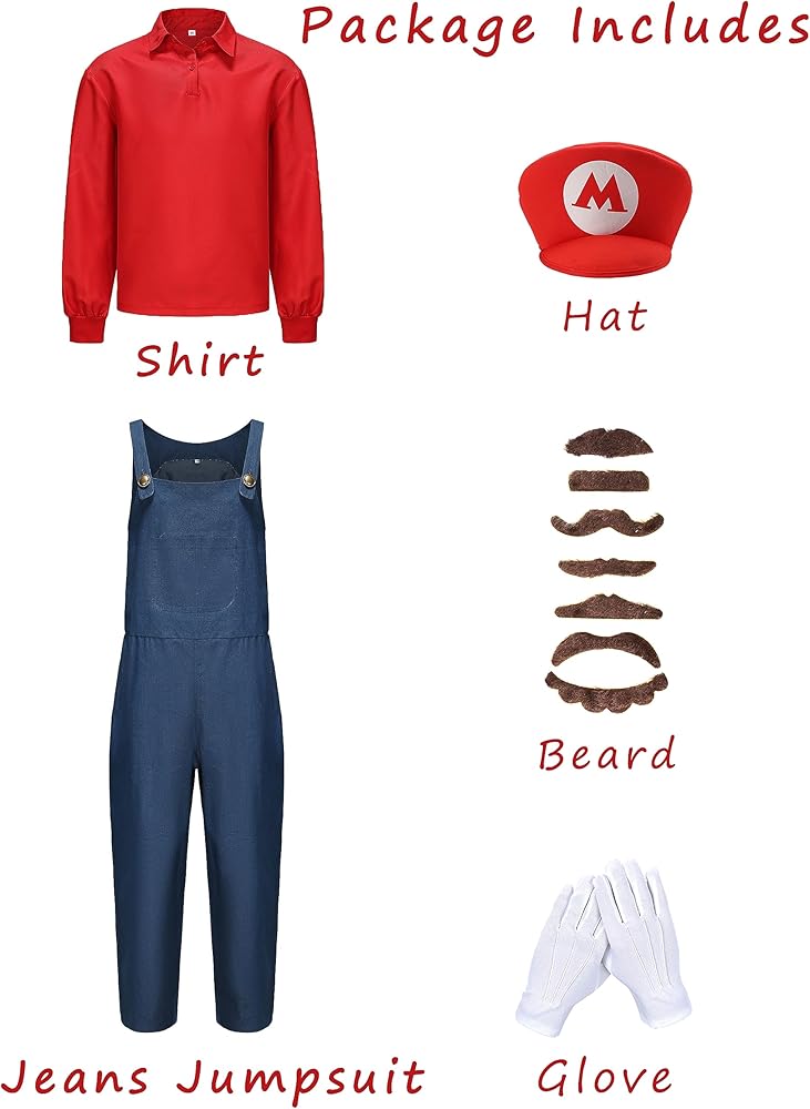 مجموعة أزياء سوبر براذرز للبالغين: 1 × بذلة جينز، 1 × قميص أحمر، 1 × قبعة، 1 × قفازات، أنواع متعددة من الشارب. التأكد من أنك تبدو مثل الشخصية وتدخلك مباشرة في اللعبة