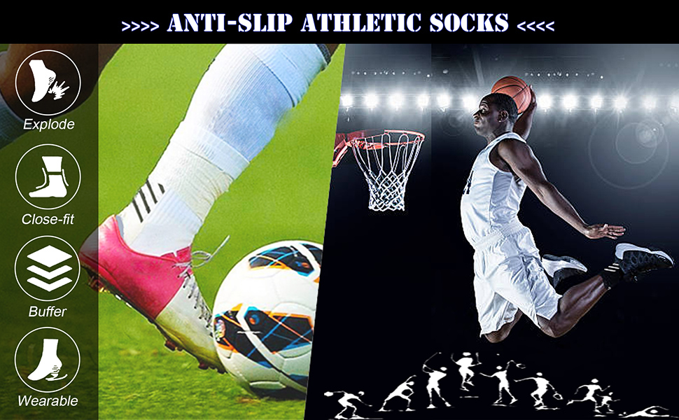 جوارب مضادة للانزلاق ---- يمكن للوسادات المطاطية الموجودة في الأسفل أن تزيد من الاحتكاك بين القدم والجوارب؛ الجوارب والأحذية أو الأرض؛ تعزيز القبضة وجعل ممارسة الرياضة أكثر أمانا. يمكنه أيضًا القضاء على آلام القدم ومكافحة البثور، وجعل الجوارب أكثر متانة.