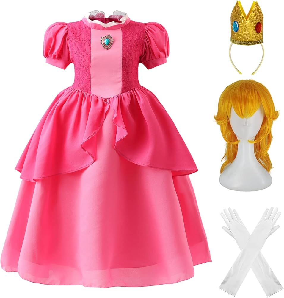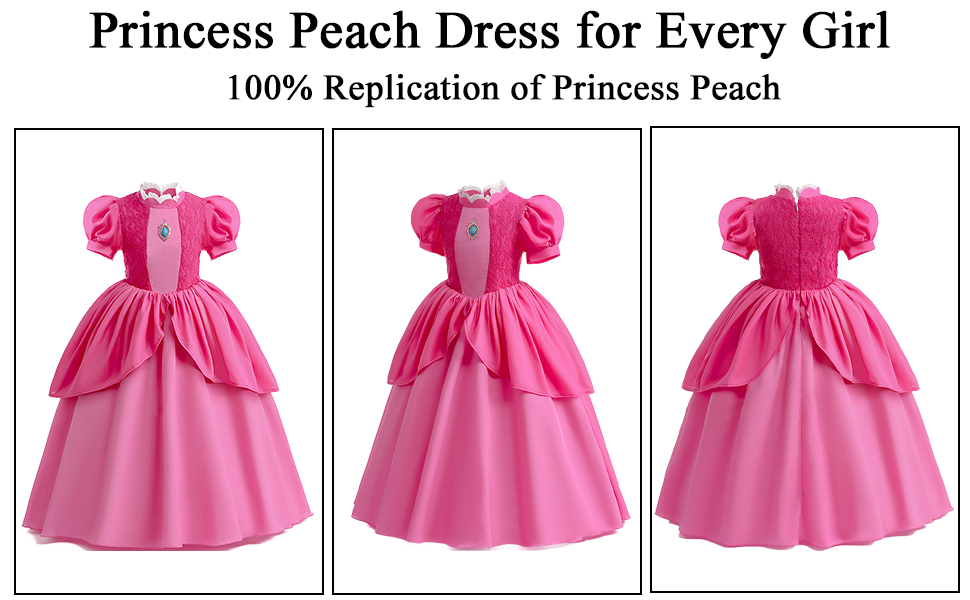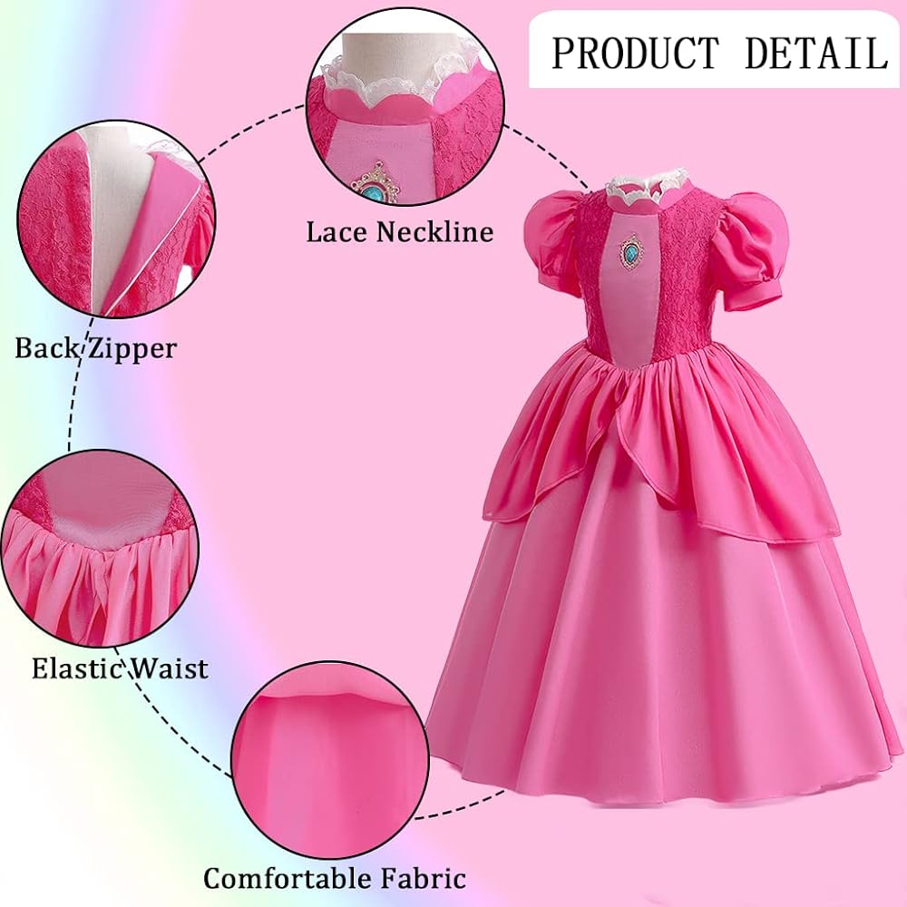 تصميم الأميرة بيتش الأيقوني: يجسد هذا الفستان جوهر الأميرة بيتش من سلسلة الألعاب الشهيرة سوبر براذرز، مما يجعله ضروريًا للمعجبين الحقيقيين وإضافة مثالية لأي مجموعة من الأزياء للفتيات والأطفال على حد سواء.