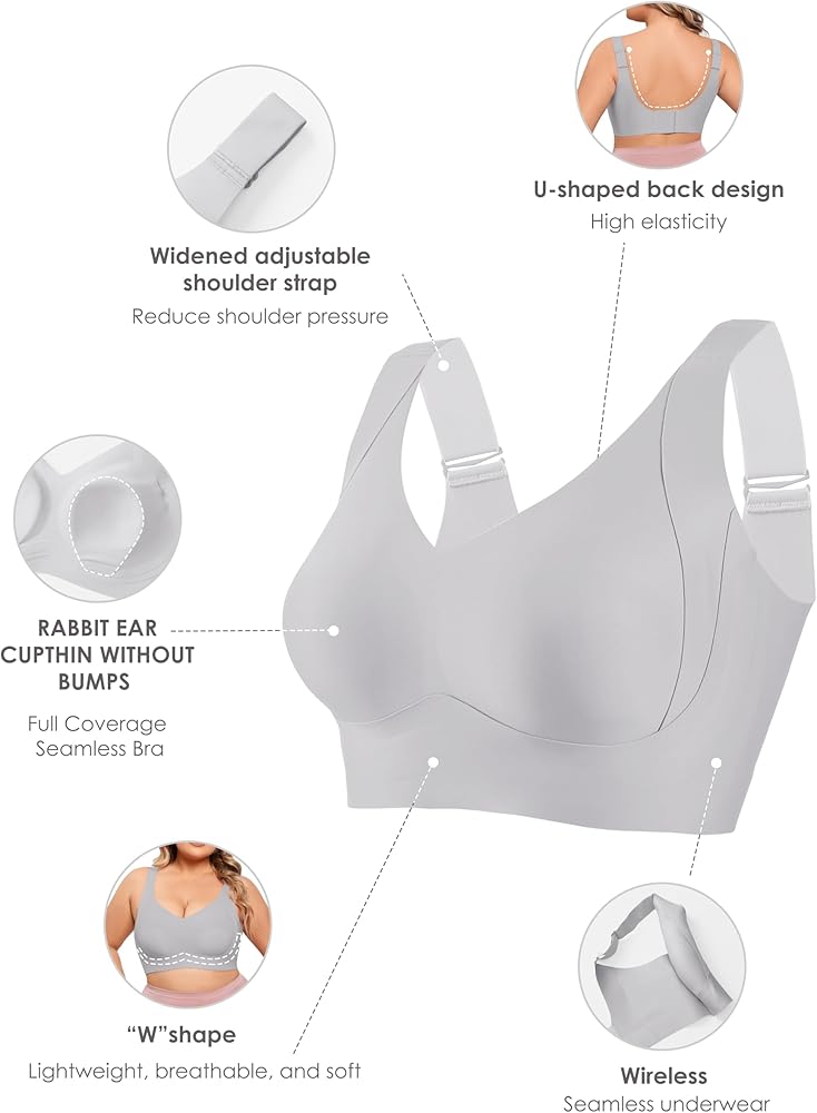 【أشرطة كتف واسعة قابلة للتعديل وإبزيم خلفي】حزام كتف عريض قابل للتعديل يلتف حول صدرك العلوي حتى لا يحفر في كتفيك ويترك أخدودًا مؤلمًا مع نسيج ناعم سحابي وأجنحة أوسع للحصول على دعم جانبي طوال اليوم ستحبينه. الضغط. يوفر تمددًا في 4 اتجاهات ويجعل حمالة الصدر اللاسلكية هذه قابلة للتنفس وخفيفة الوزن.