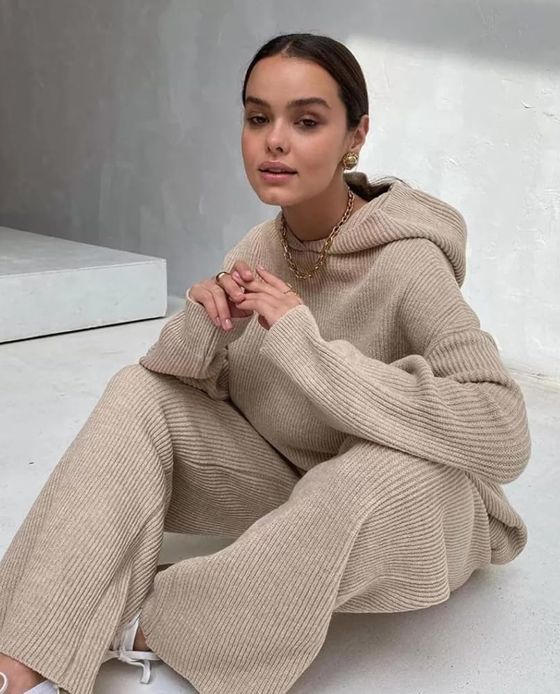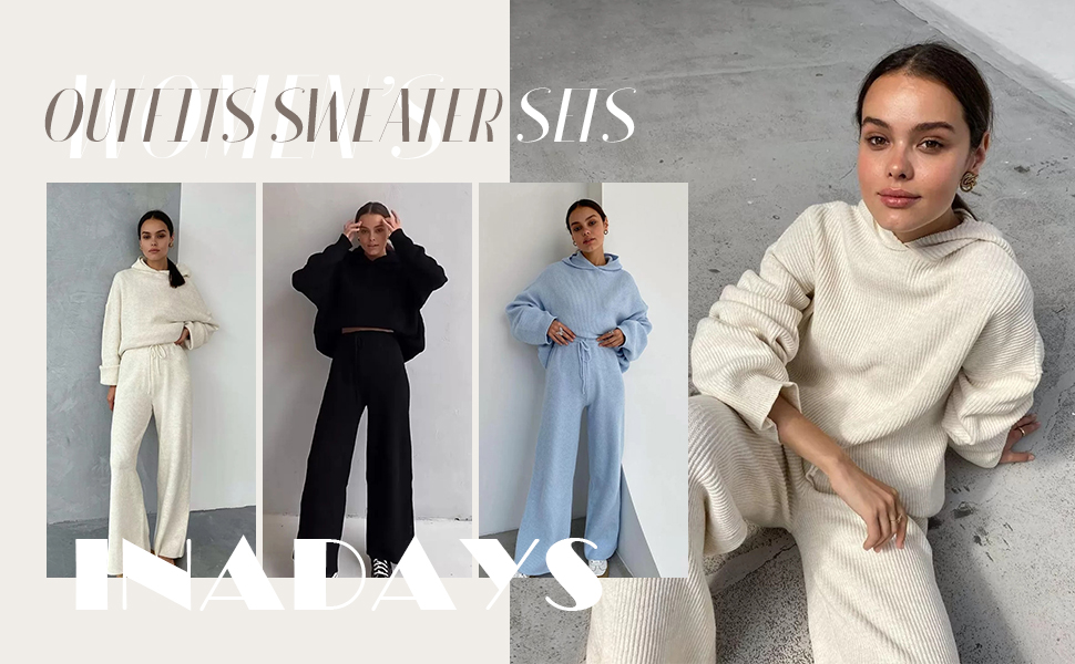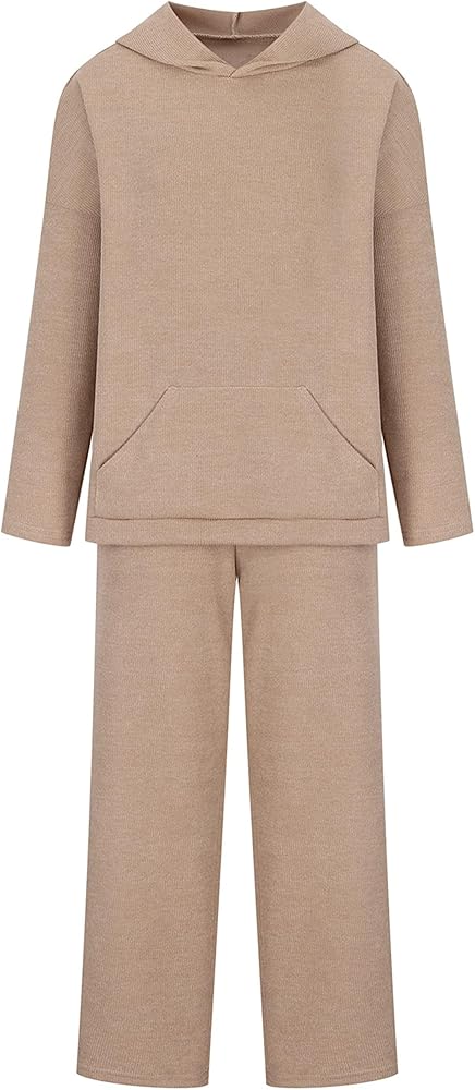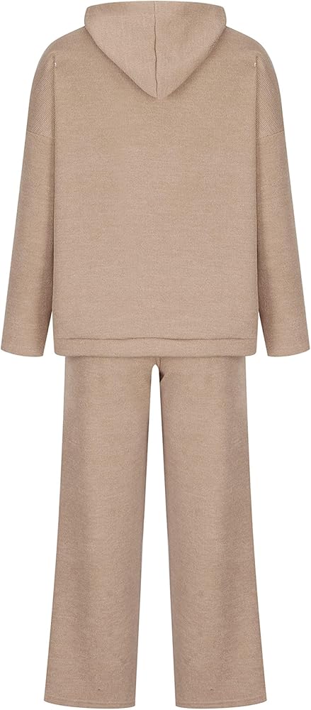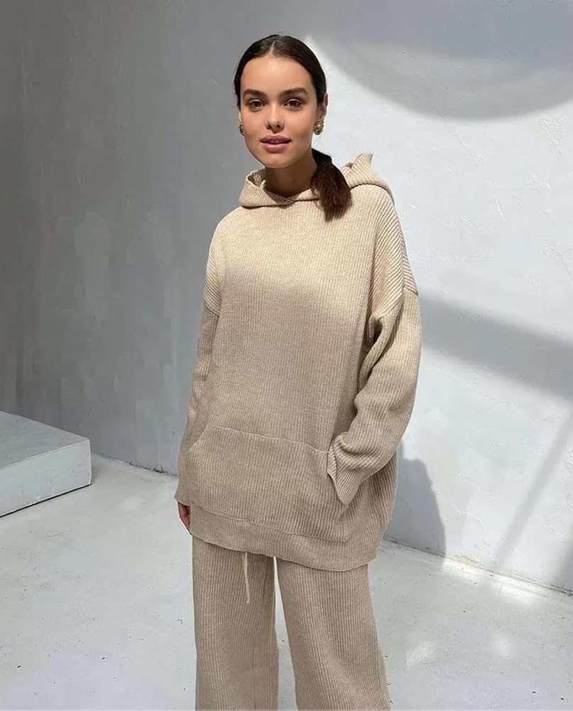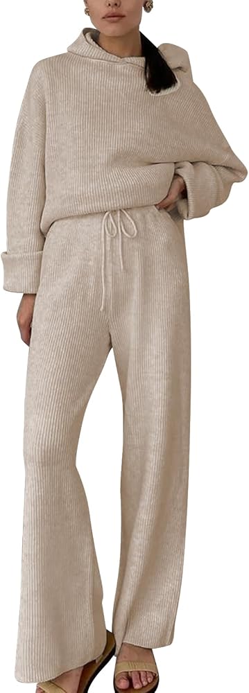 التصميم: سترة علوية بغطاء رأس محبوكة بأكمام طويلة تتميز برقبة دائرية، وكتف دورب، وحاشية مقسمة. بنطال طويل: خصر عالٍ، حزام خصر مطاطي مريح، ملون، سروال نسائي واسع الساق فضفاض بنطلون Palazzo