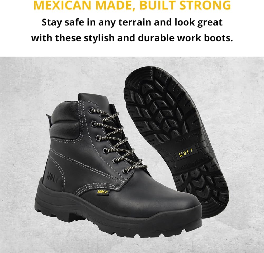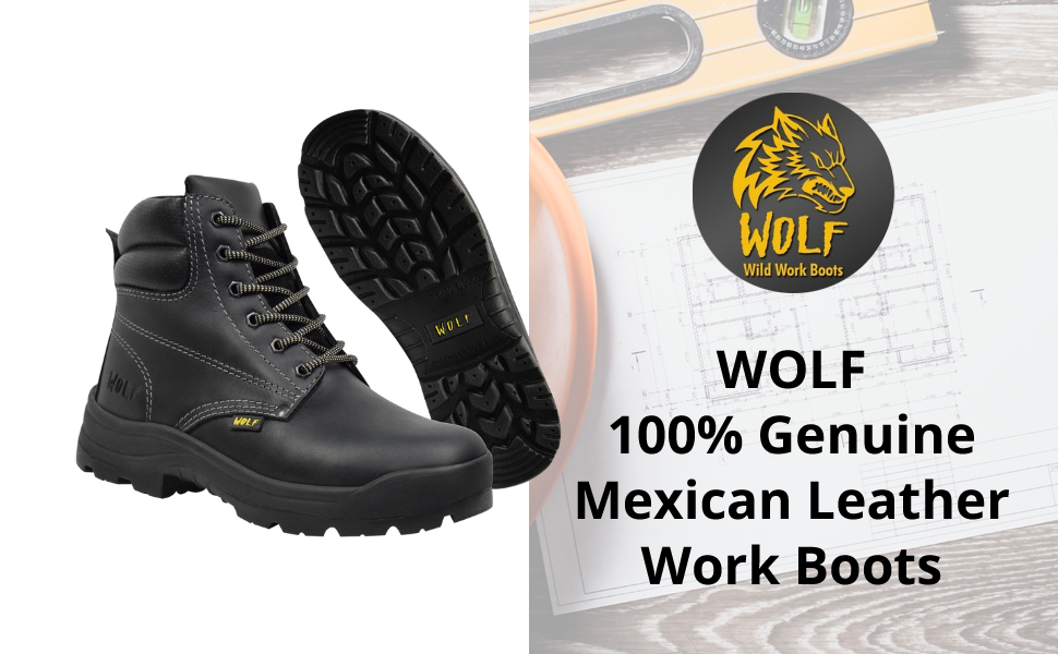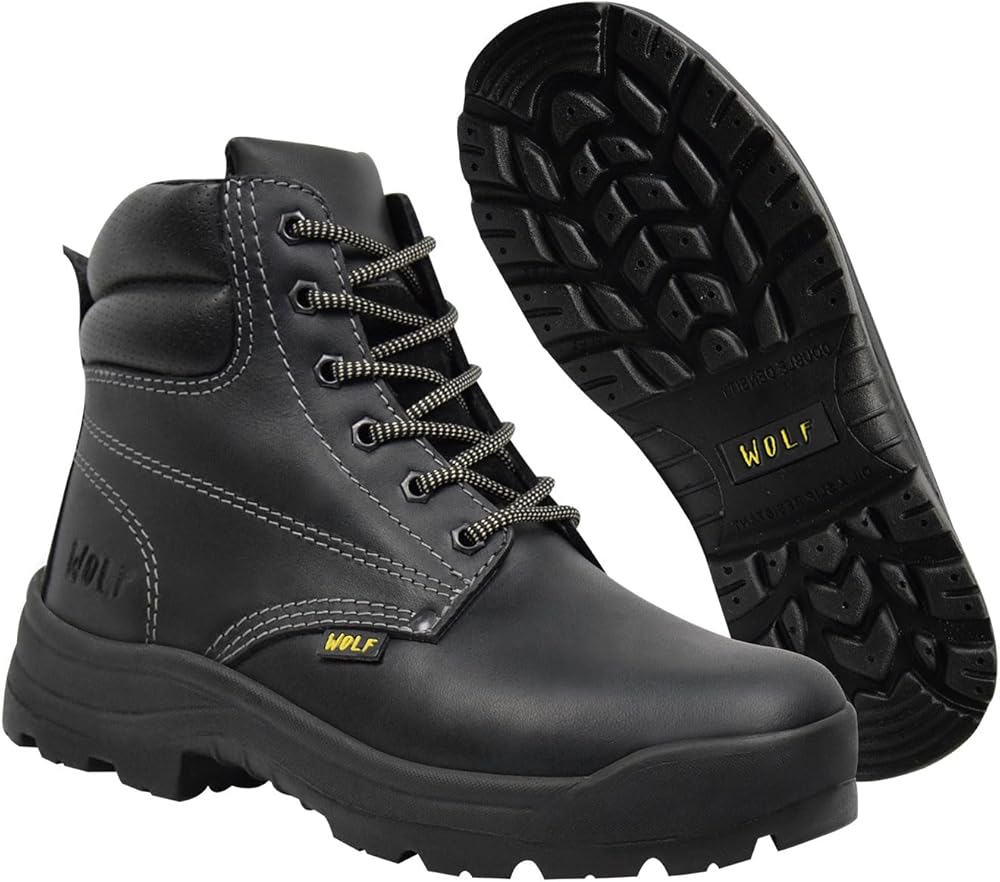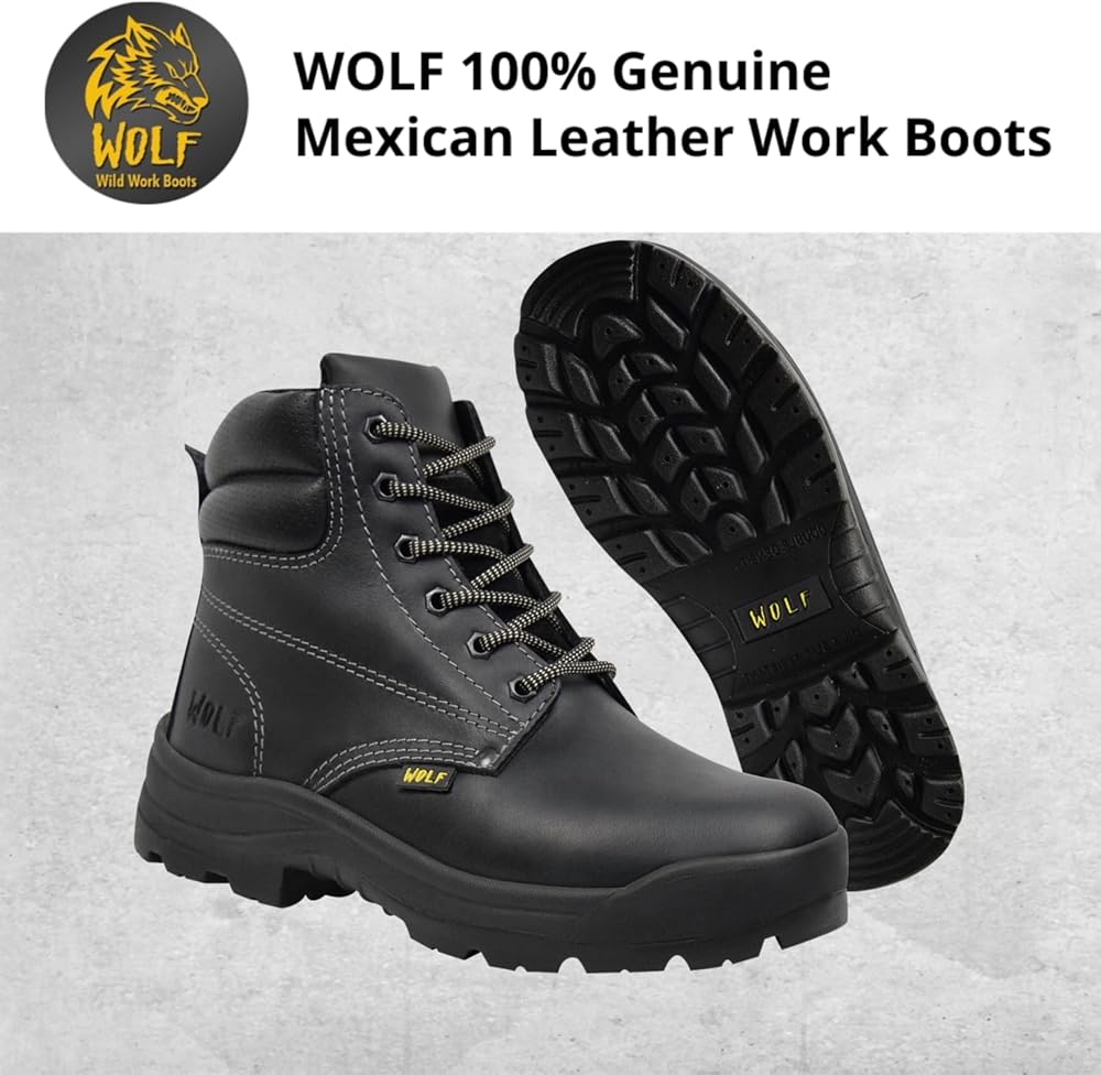 حذاء العمل وولف | جلد البقر المكسيكي الأصلي المقاوم للماء | مقاومة للمواد الكيميائية والنفط | معزول | نعل بتقنية الهواء غير قابل للانزلاق | بوسكن | طوق مريح مبطن | معدات الحماية الشخصية الصناعية للبناء