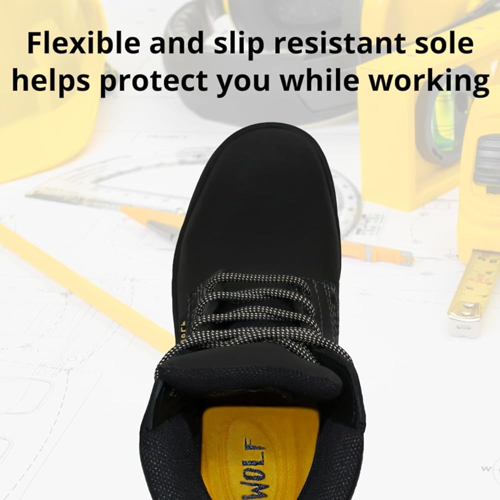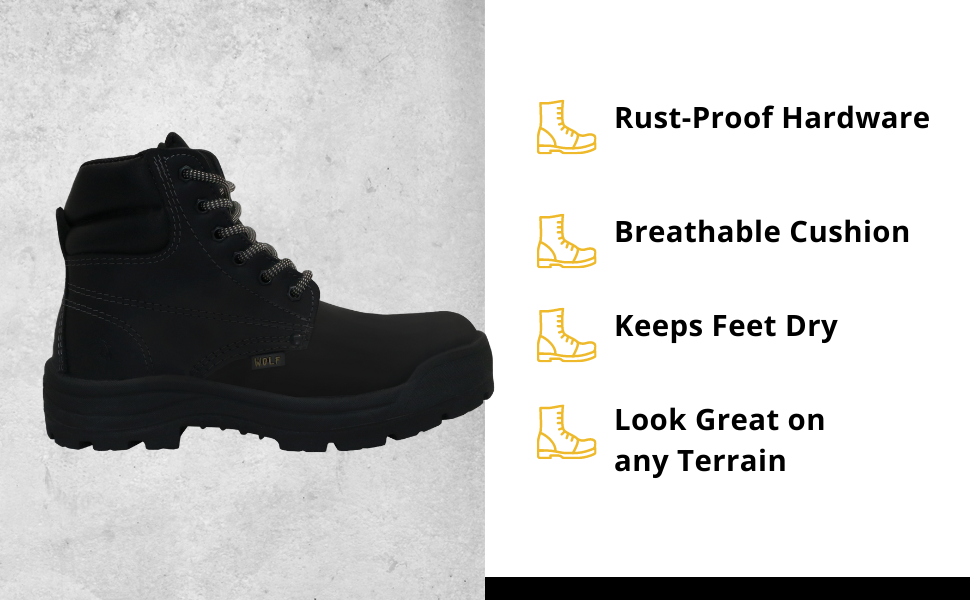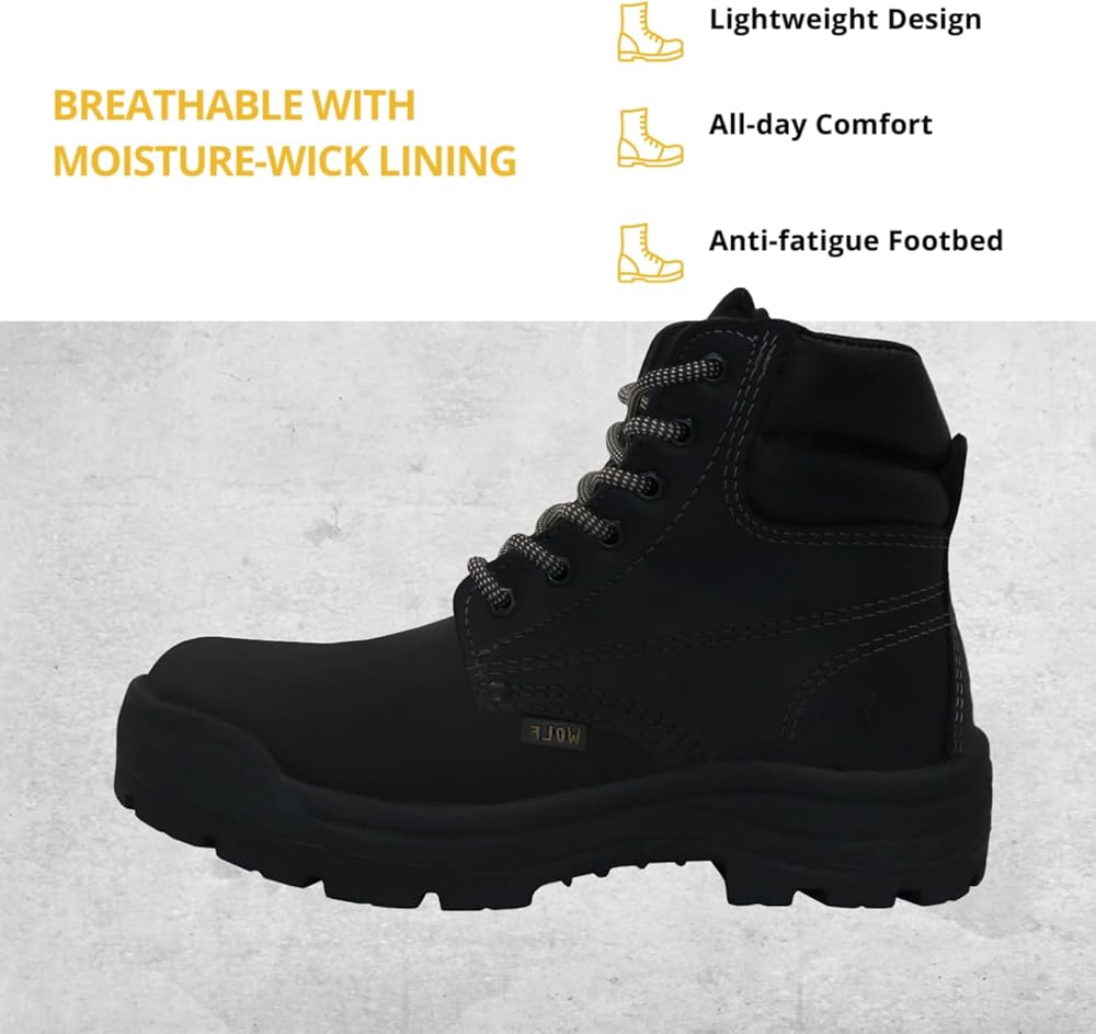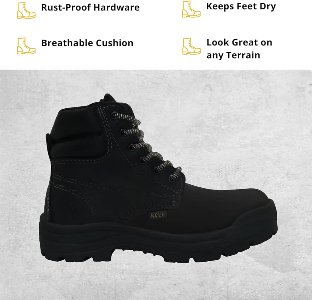 حذاء العمل وولف | جلد البقر المكسيكي الأصلي المقاوم للماء | مقاومة للمواد الكيميائية والنفط | معزول | نعل بتقنية الهواء غير قابل للانزلاق | بوسكن | طوق مريح مبطن | معدات الحماية الشخصية الصناعية للبناء