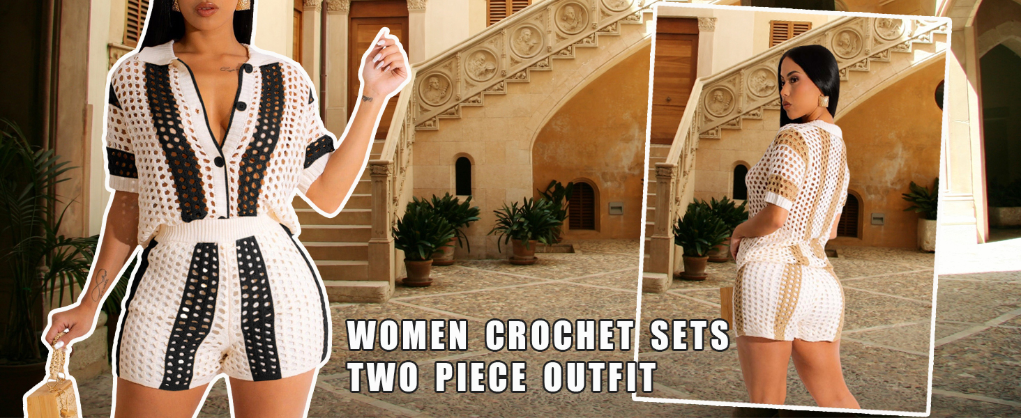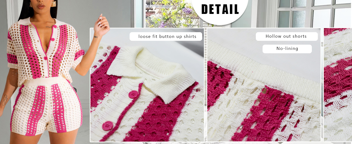 • Feature: Knit Short Sets Women 2 Piece Outfits features with Color Block Short Sleeve Button Down Loose Fit Shirt Top and High Waisted Shorts Set, Crochet Outfits for Beach Vacation, Summer Bikini Cover Ups, Knitted Lounge Matching Set, Y2k Street Sets, Two Piece Jumpsuits, Club Outfits for Women, Sexy and Cute.