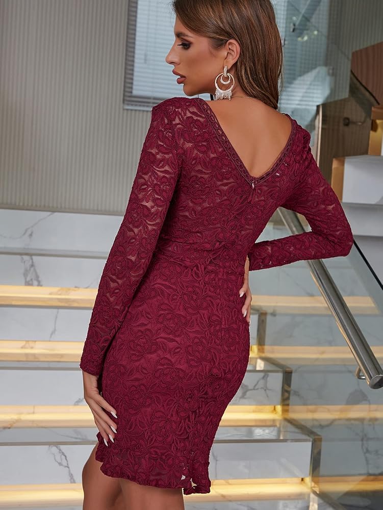 - المزايا: دانتيل زهور، شبكي، شفاف، رقبة على شكل حرف V، أكمام طويلة، زخرفة مكشكشة، لون ثابت، مقاس نحيف، سحاب خلفي، فستان قلم رصاص