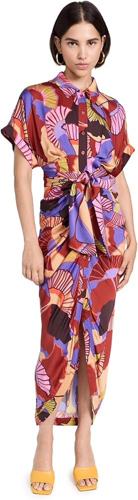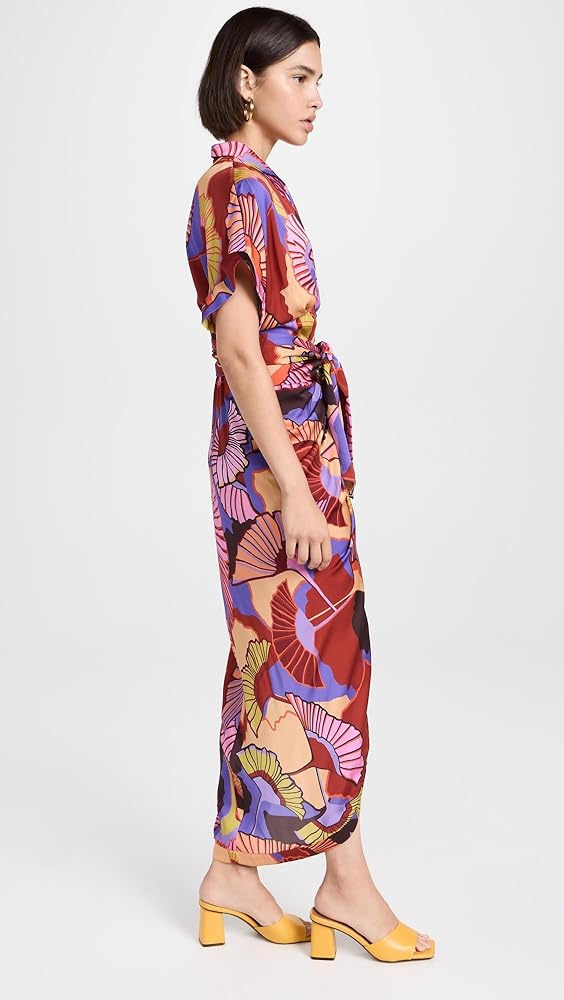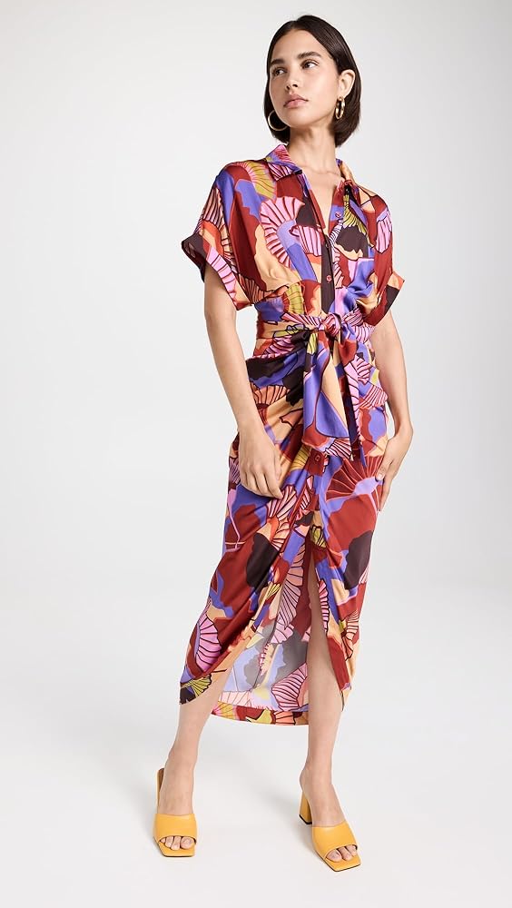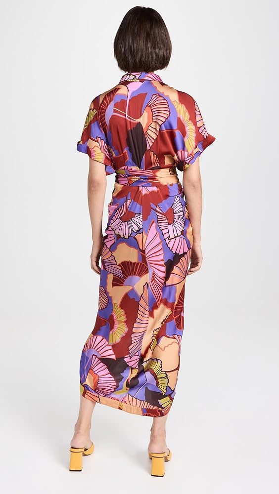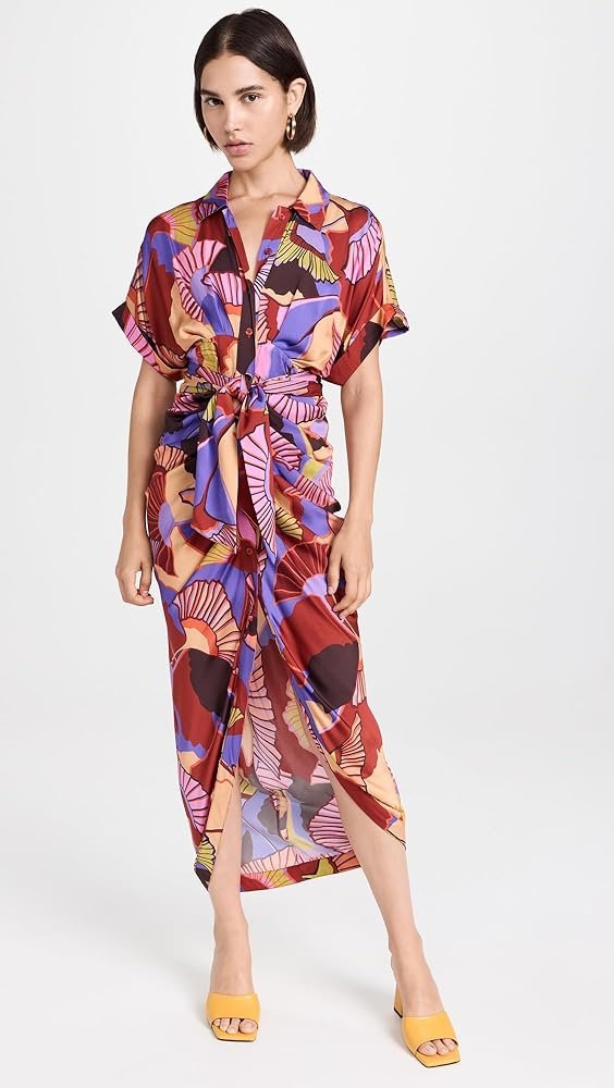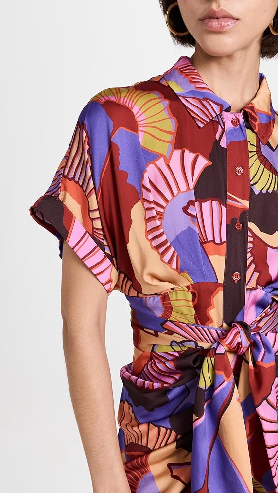 - أكمام قصيرة مع أساور ثابتة، خط عنق بياقة وفتحة أزرار، حاشية منحنية وحزام ذاتي الربط، طباعة زهور