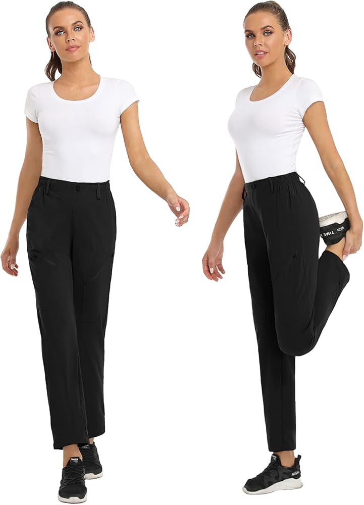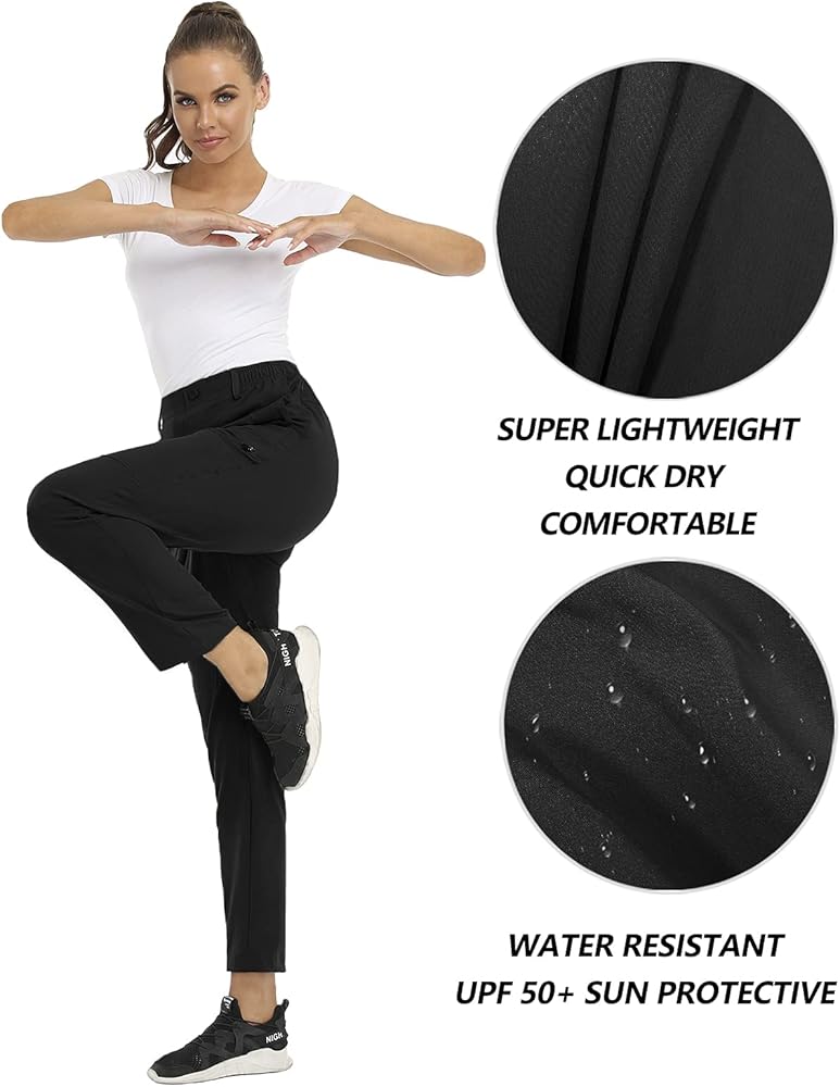 نسيج مريح: مصنوع من نسيج رقيق ومتين ومرن قليلاً، مريح يتمدد في 4 اتجاهات لتحسين نطاق الحركة. خفيف الوزن، ومسامي، وسريع الجفاف، ومقاوم للماء، ومثالي للأنشطة الخارجية. يوفر النسيج الواقي من الشمس UPF 50+ حماية ممتازة. سوف تجعلك سراويل المشي لمسافات طويلة النسائية تشعر بالانتعاش والانتعاش.