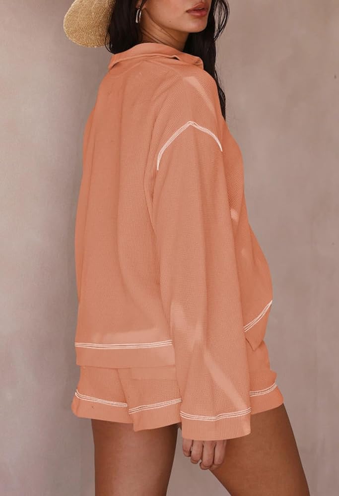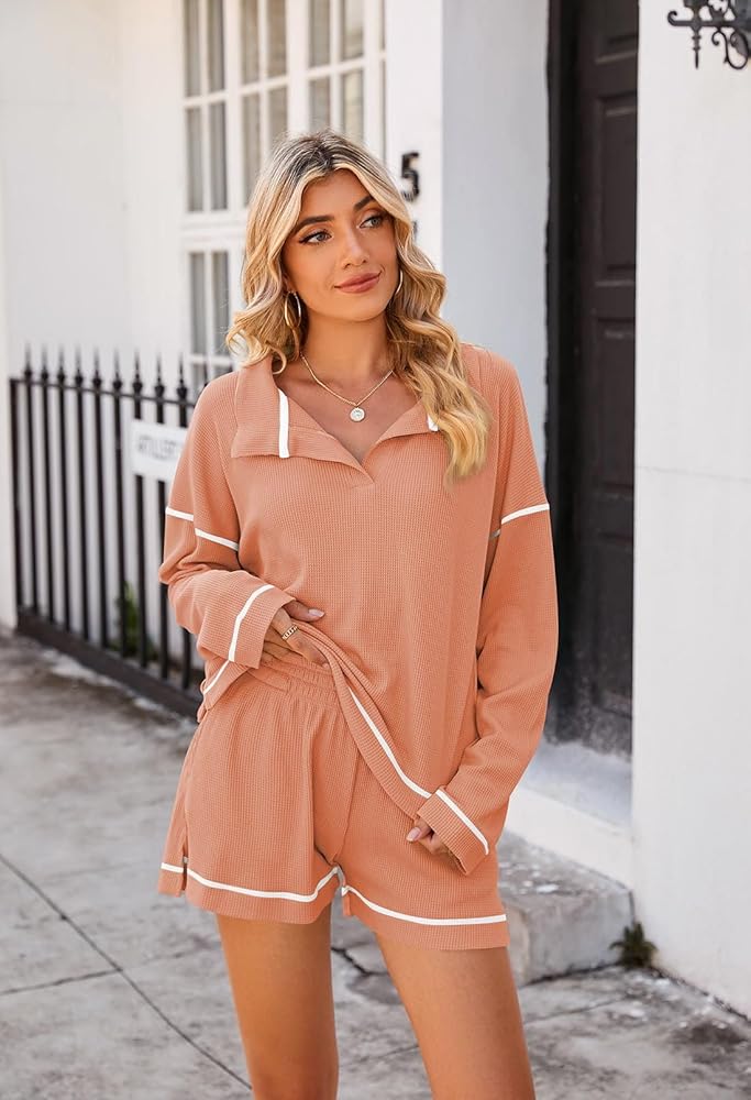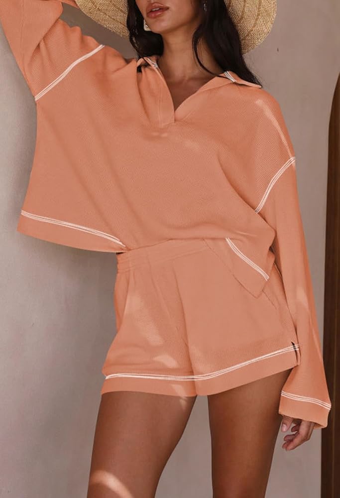 - تصميم عصري وفريد من نوعه: قميص برقبة على شكل حرف V مع شورت عالي الخصر متطابق للنساء
