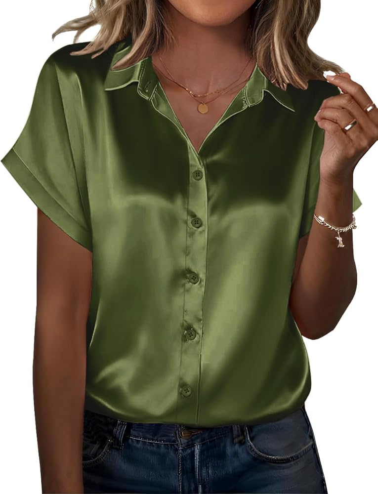 تصميم أنيق: قمصان بأزرار سفلية، قمصان ساتان قصيرة الأكمام، قمصان كلاسيكية برقبة على شكل حرف V، سترة فضفاضة، قمصان كاجوال عصرية، قميص عمل بياقة مطوية لأسفل، بلوزات مكتب، قمصان علوية بأزرار لأعلى، قمصان تونيك حريرية. يمكنك ارتداء القمصان الحريرية في كل الفصول