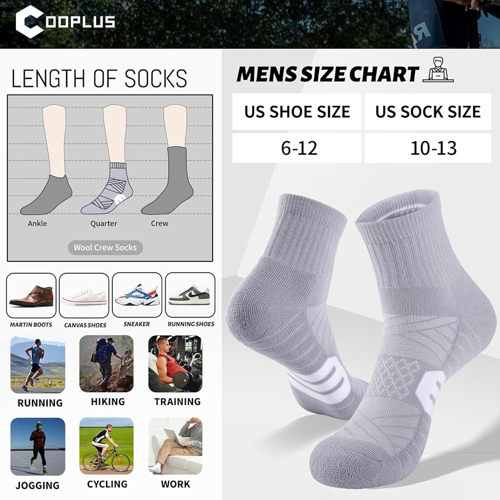 [جوارب مريحة للكاحل]: جوارب الكاحل الرياضية من COOPLUS للرجال لديها أقصى وسادة على إصبع القدم وفي الأسفل مع خيوط أكثر سمكًا لتقليل الاحتكاك والبثور، وإضافة المزيد من الراحة. تستخدم جوارب العمل الرجالية هذه مواد ناعمة ومتينة لمنع كسر الثقوب. جوارب الجري هذه للرجال مقاس متوسط للأحذية الرجالية الأمريكية مقاس 6-12، جوارب الكاحل للرجال مقاس 10-13.