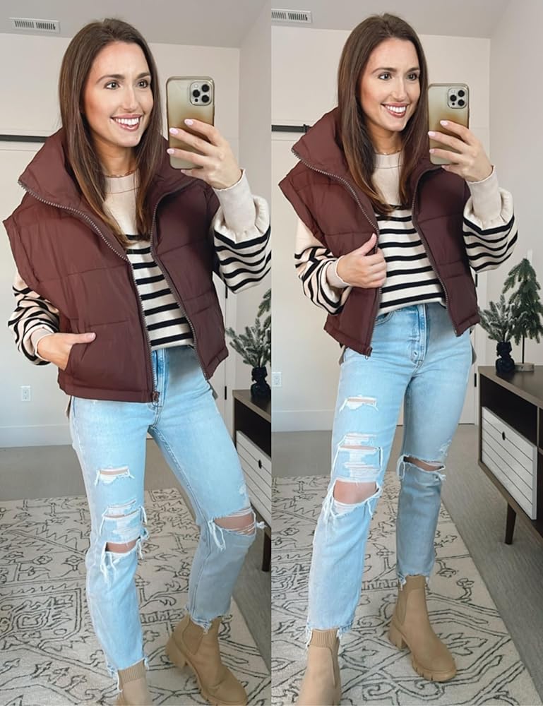 مطابقة - تتميز السترة النسائية المبطنة بأنها متعددة الاستخدامات ويمكن ارتداؤها مع القمصان والسترات الصوفية والبلوزات لخلق نمط عصري