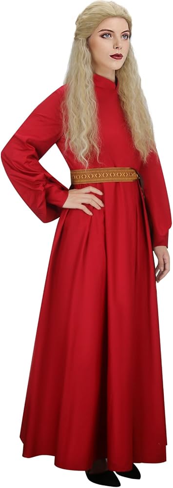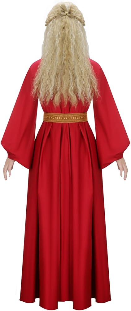 هذا الفستان الطويل باللون الأحمر من عصر النهضة مصنوع من البوليستر، مريح ومسامي، وياقة واقفة، وأكمام واسعة مع أطراف أكمام مناسبة، وسحاب خلفي، وبدلة من قطعة واحدة، وشعر مستعار طويل أشقر مجعد قليلاً، وحزام منسوج بالزهور، الزي بأكمله رائعتين جدا!