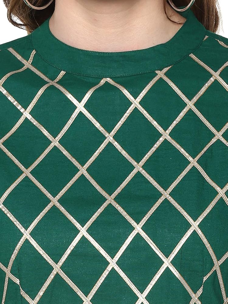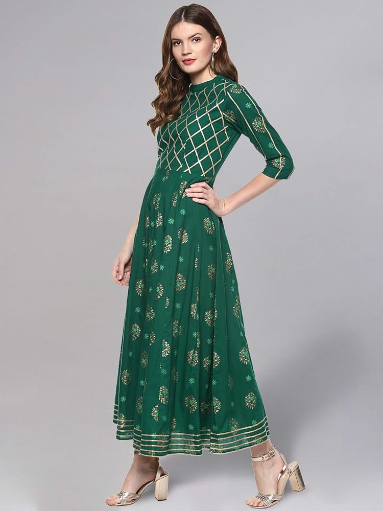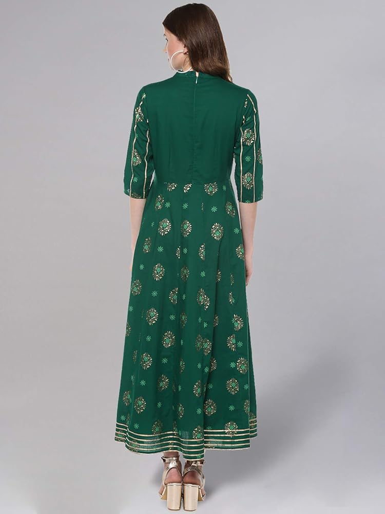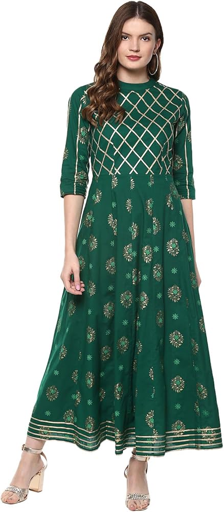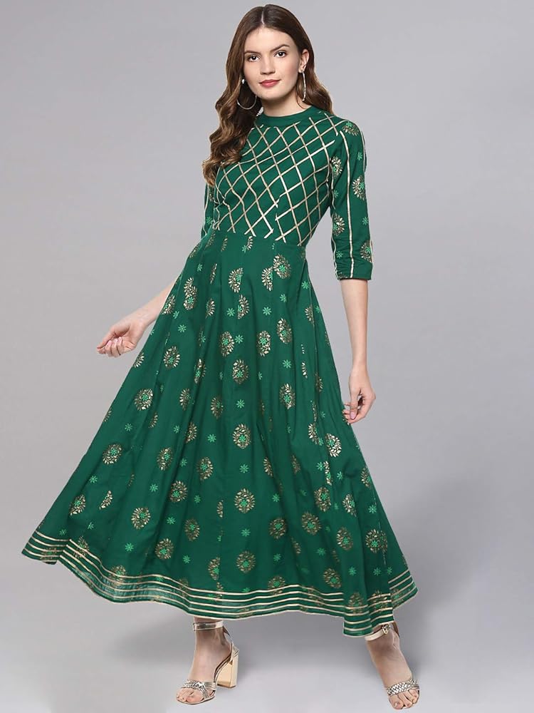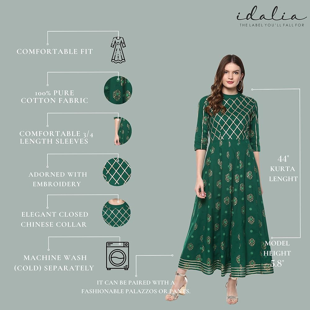 الوصف - كورتا أناركالي مطبوعة باللون الذهبي، مع ياقة صينية مغلقة، وأكمام ثلاثة أرباع، وتفاصيل جوتا، وكورتا بطول الكاحل، وحاشية واسعة.