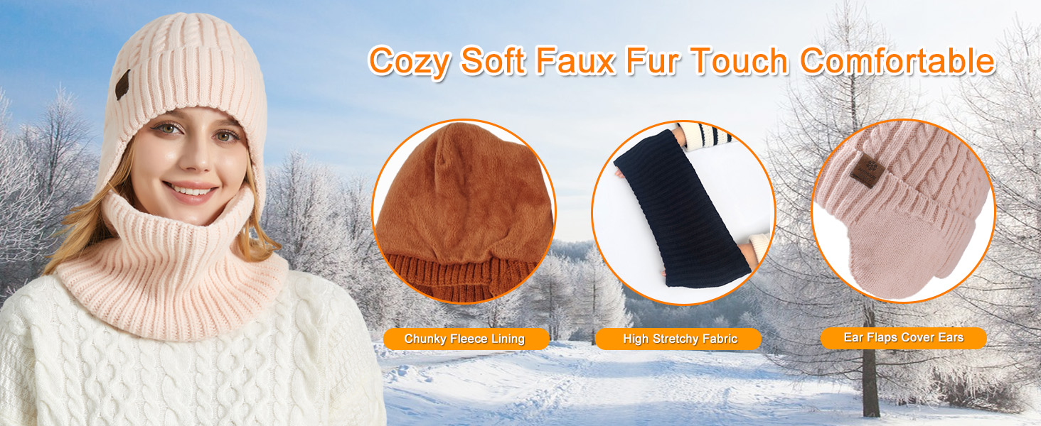 يضمن نسيج الأكريليك المحبوك بالكابل المطاطي ملاءمة مريحة لمعظم رؤوس البالغين. تضيف البطانة الصوفية المغطاة بالكامل طبقة إضافية من الدفء وتعمل كحاجز مقاوم للرياح، وتحمي رأسك ووجهك ورقبتك في أقسى ظروف الشتاء.
