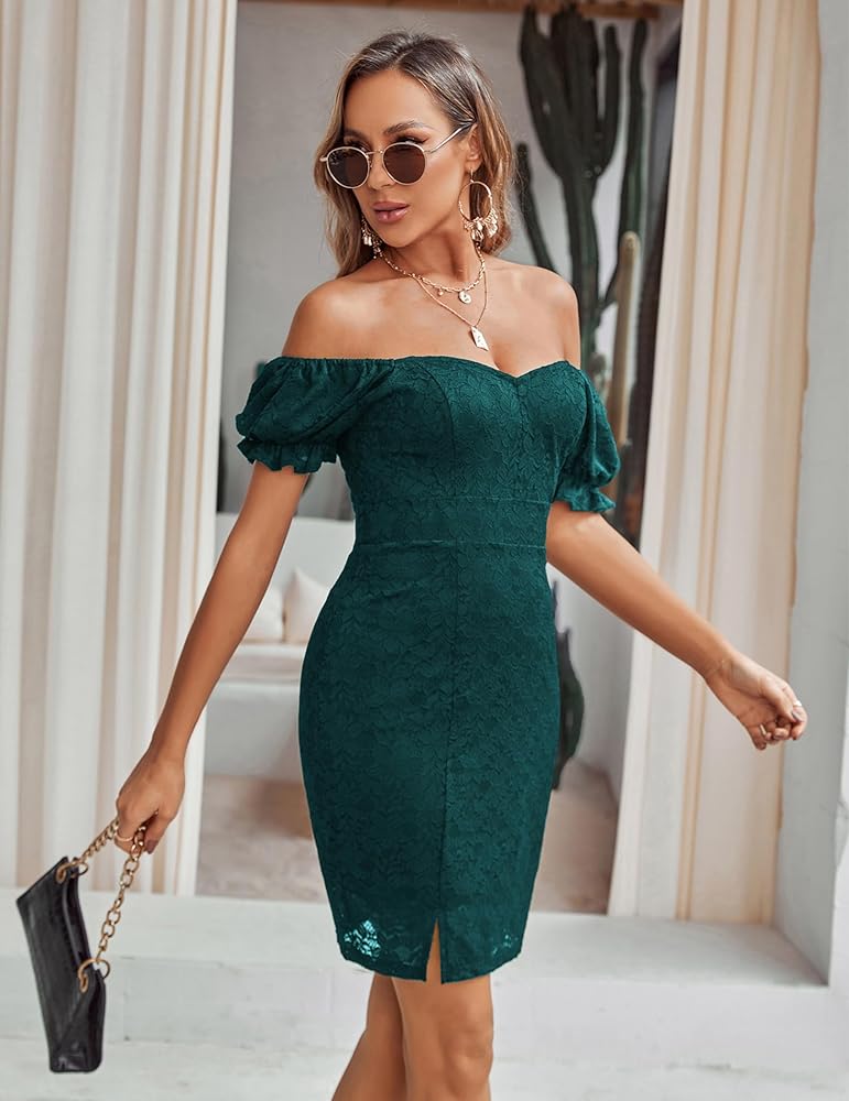 【تصميم مقصوص】: تصميم خارج عن الكتف مع أشرطة سباغيتي، بدون أكمام مع كشكشة مزخرفة، يصل إلى منتصف الفخذ، نسيج دانتيل ناعم قابل للتمدد، فساتين ضيقة من الدانتيل.