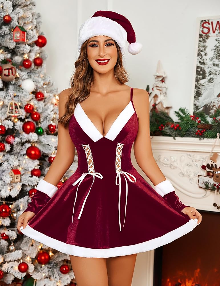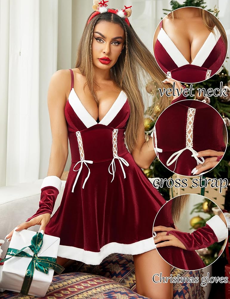 【النمط】ملابس داخلية لعيد الميلاد من الفرو برقبة على شكل حرف V للنساء، فستان عيد الميلاد للنساء، فستان سانتا مخملي للنساء، ملابس داخلية سانتا برقبة على شكل حرف V، مجموعة ملابس داخلية حمراء للنساء، زي سانتا بند، ملابس داخلية مخملية