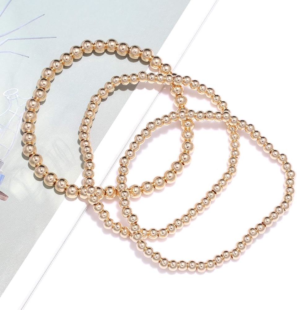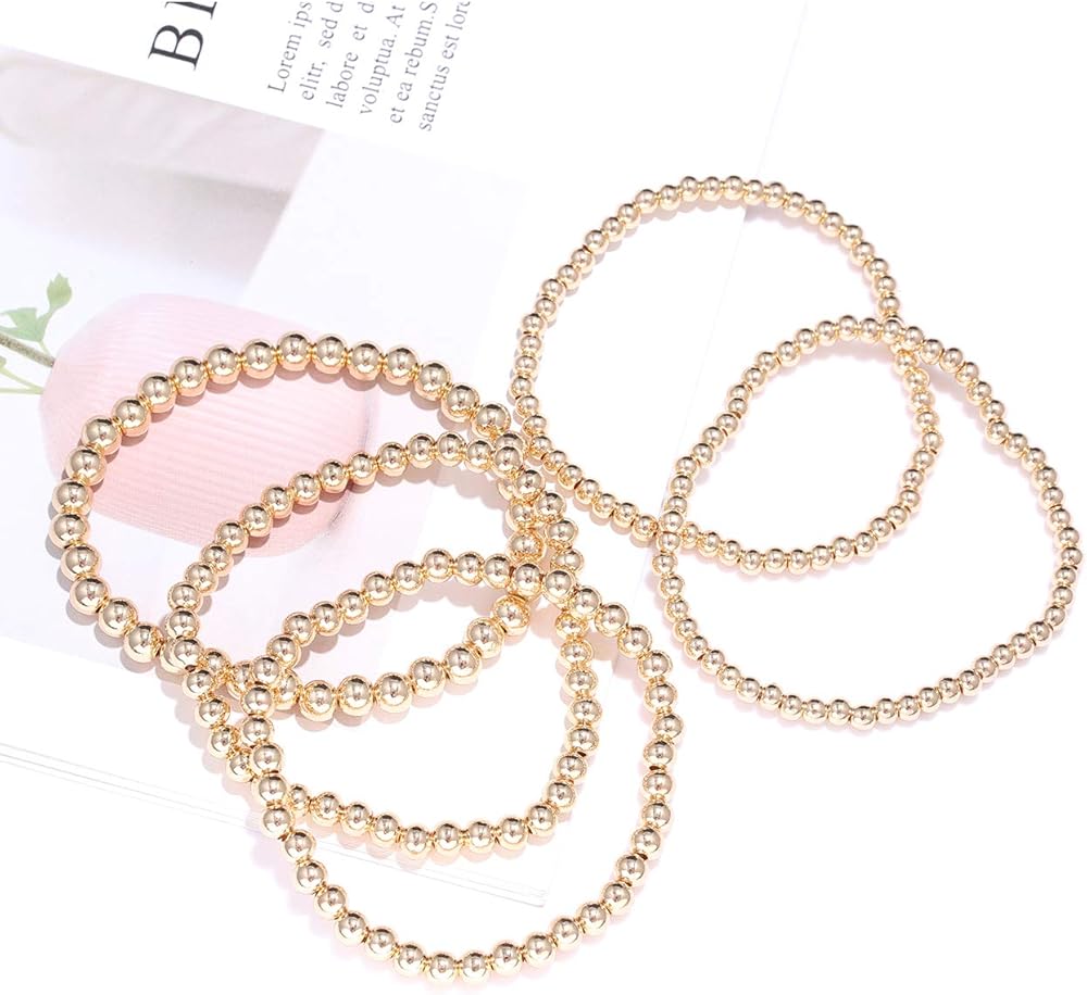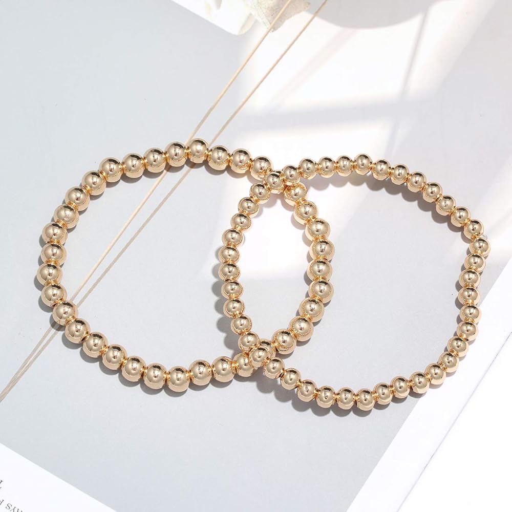 حجم سوار الخرز القابل للتكديس: مجموعة أساور كلاسيكية مطرزة بالذهب مصنوعة من خرز كروي دائري صغير مقاس 4 مم و5 مم و6 مم.. قطر السوار المطاطي البوهيمي البسيط: 2.7 بوصة، سوار مطرز قابل للتمدد يناسب معظم مقاسات المعصم للنساء والرجال والفتيات المراهقات بسهولة.